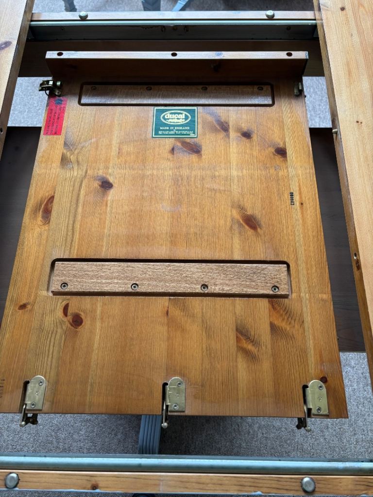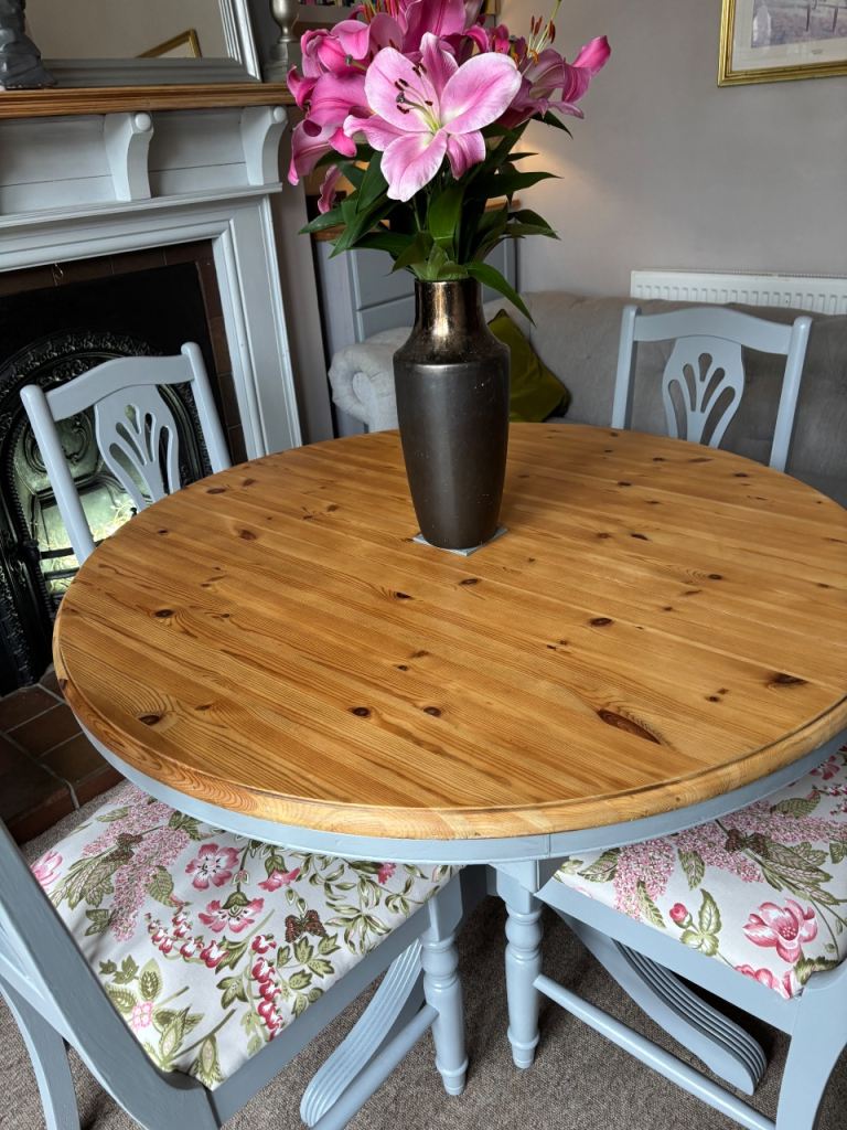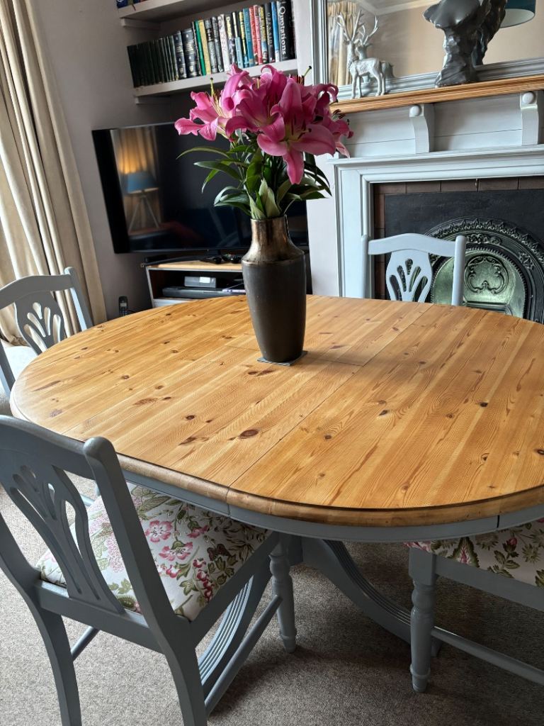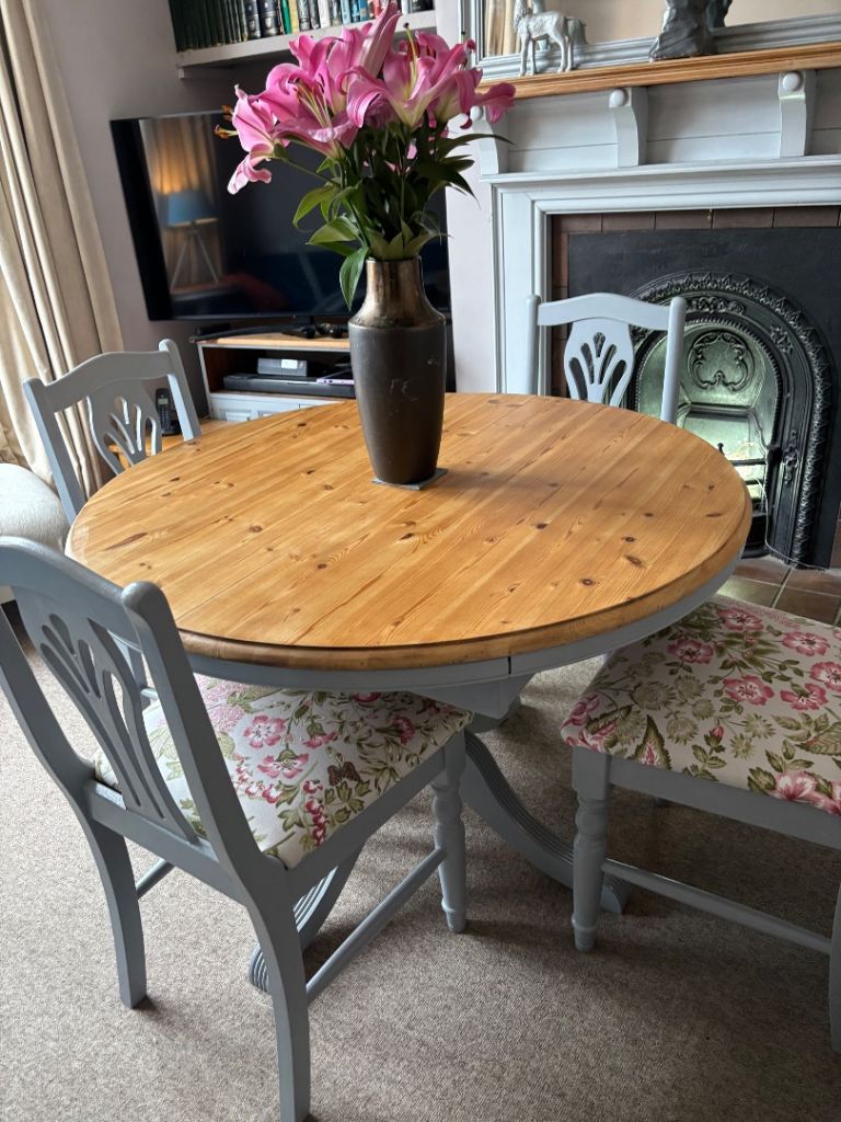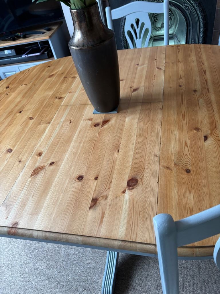 Lovely quality Ducal dining set with original chairs. All newly refurbished, dark stain and varnish removed to showcase the natural wood grain and finished with several coats of clear protection. These tables are built to last and with heavy, thick table tops.