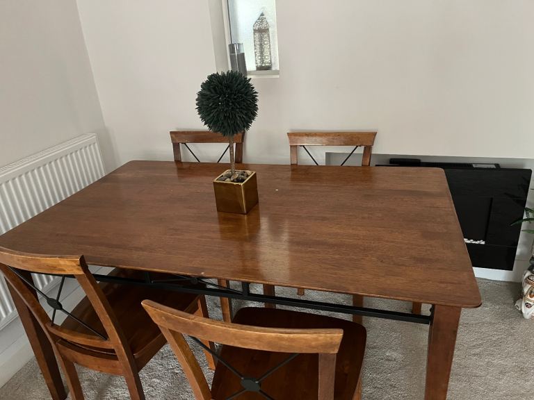 Next table and chairs brown wooden 90 cm width and length 150cm with wooden chairs please note we cannot deliver. This is a pre-assembled so may require a van to transport