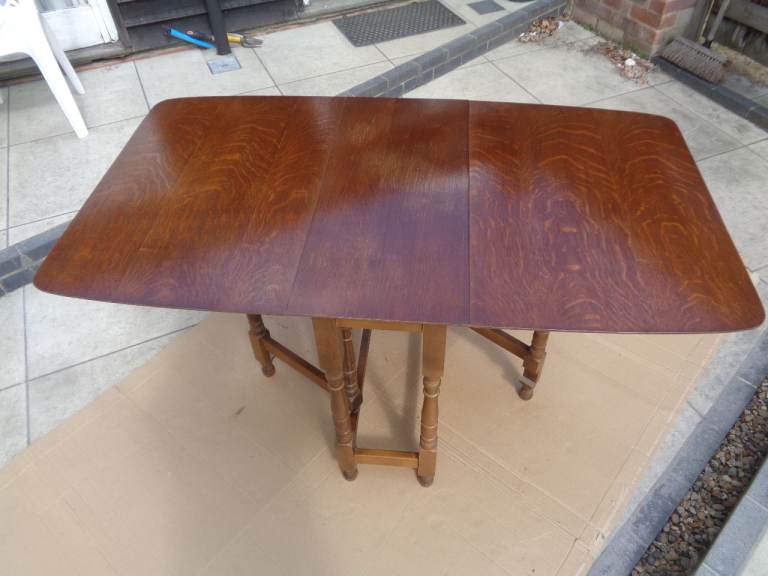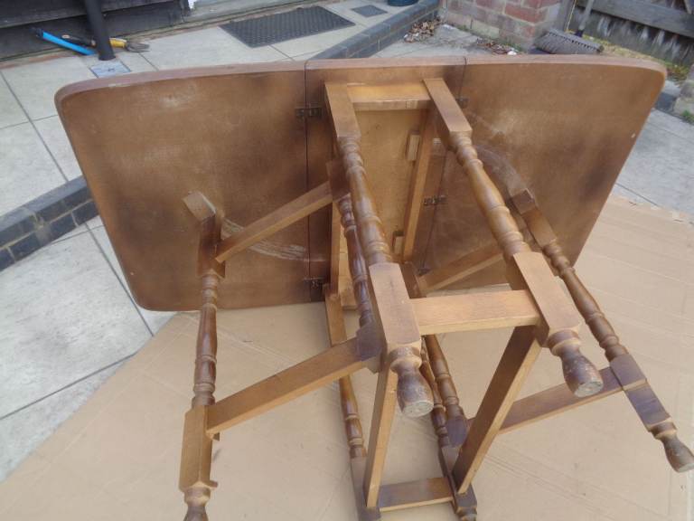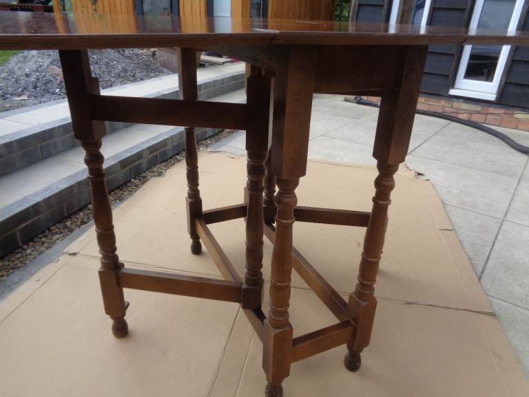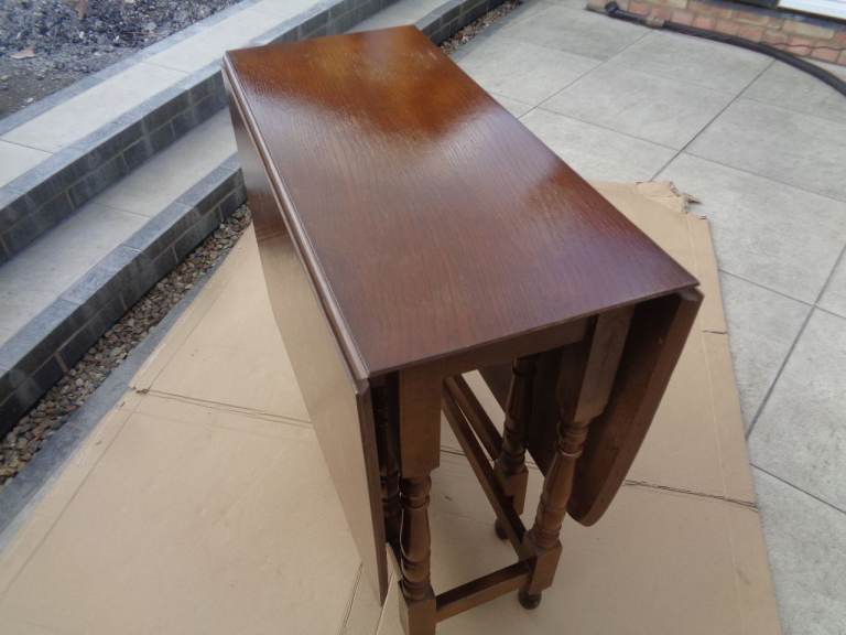 Small, pretty and useful gateleg table. Good for a hall table, work or games table, or extra guest dining. Closed table Top is 29.5in x 13in ( 52in with wings up) Height 29.5in. (approx sizes) Generally in good clean condition. Cash on collection please, free local delivery may be possible.