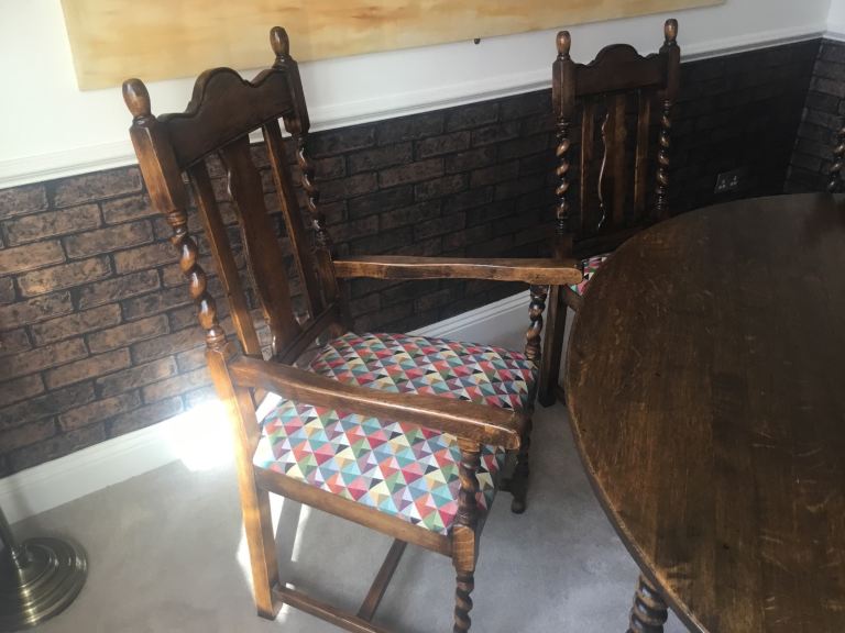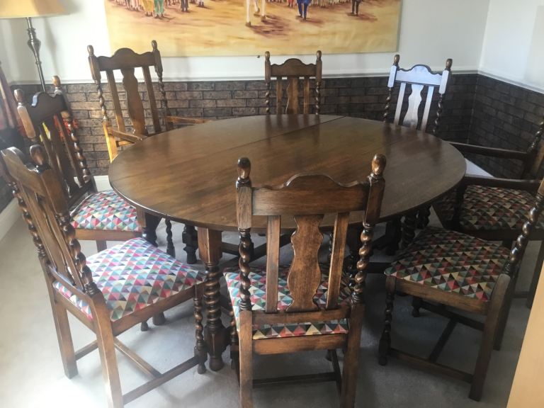 Wonderful, round vintage gate leg dining room table. Complete with six dining chairs, and two carver chairs.