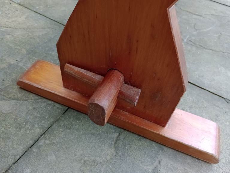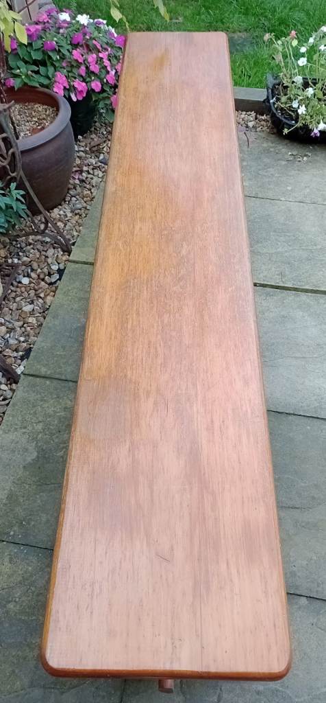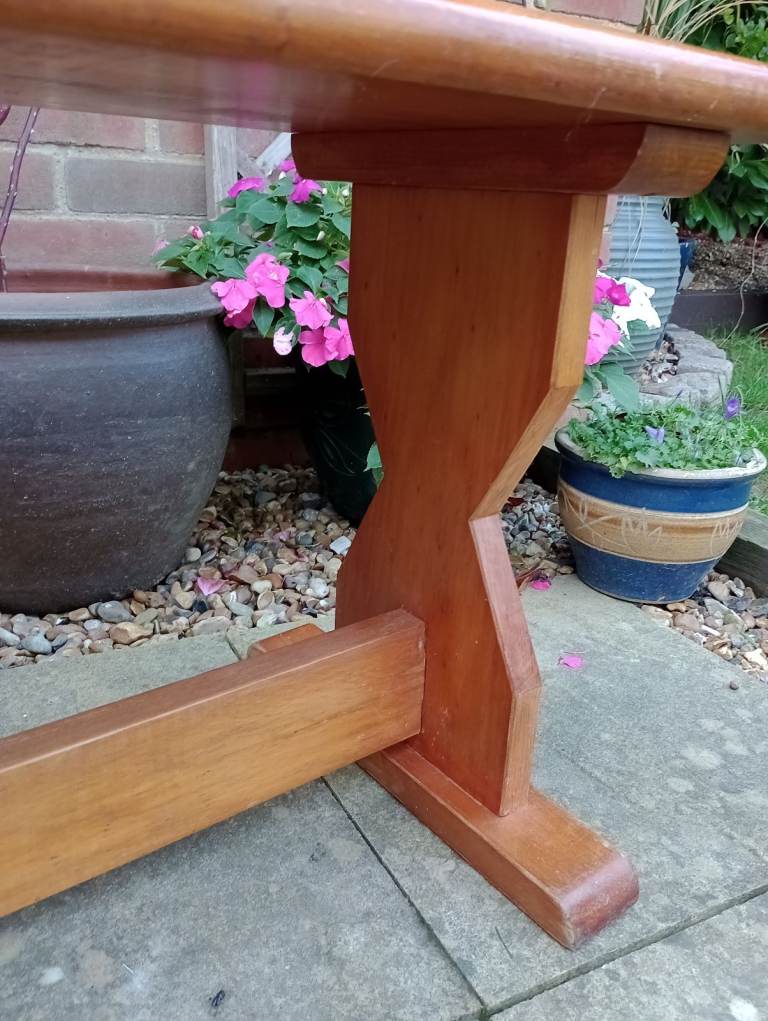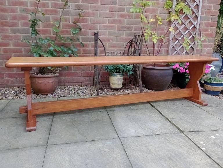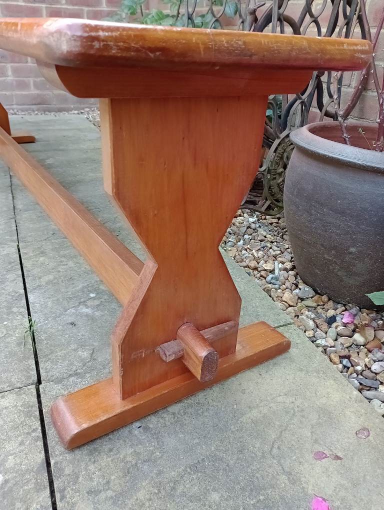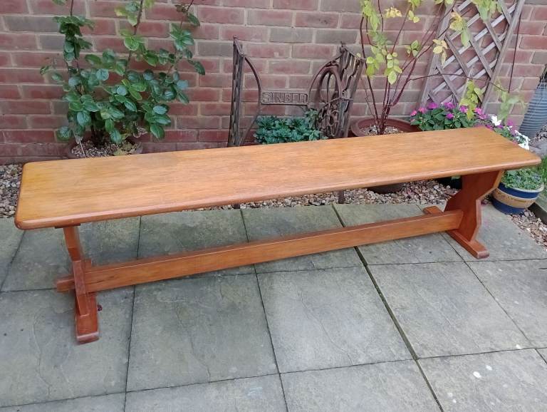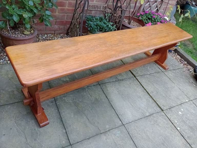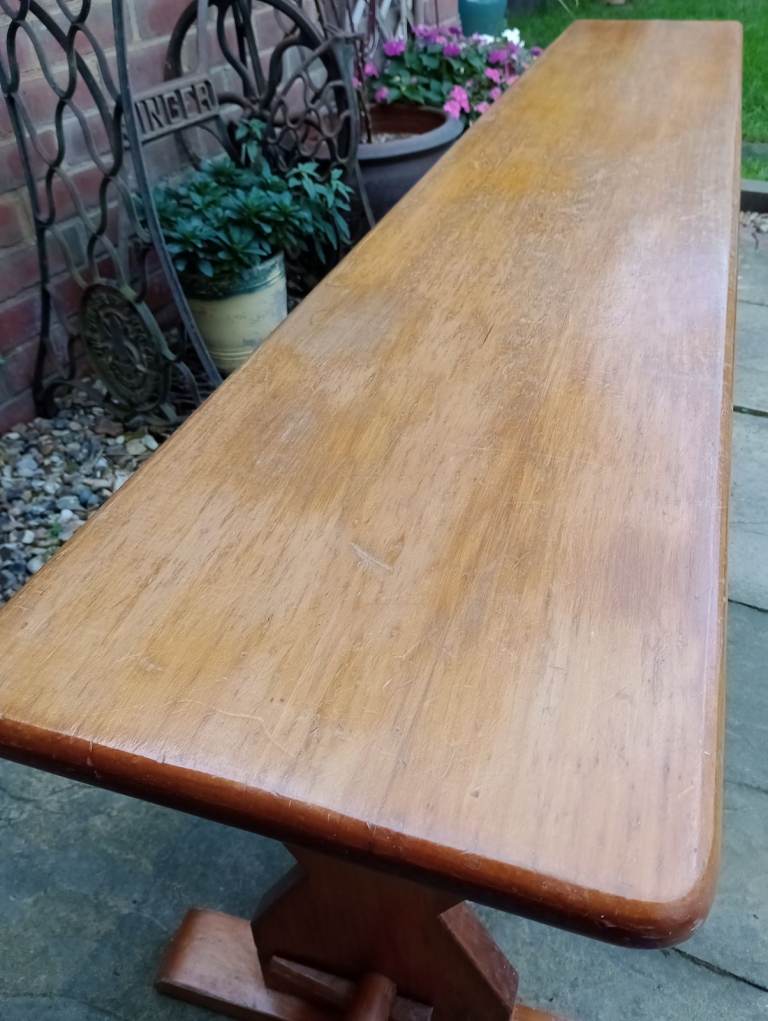 Raised on attractively shaped ends with moulded tops and feet and a baluster silhouette column. With a long stretcher joined to the ends with a through tenon and tusk joint and braced in the centre for extra strength.