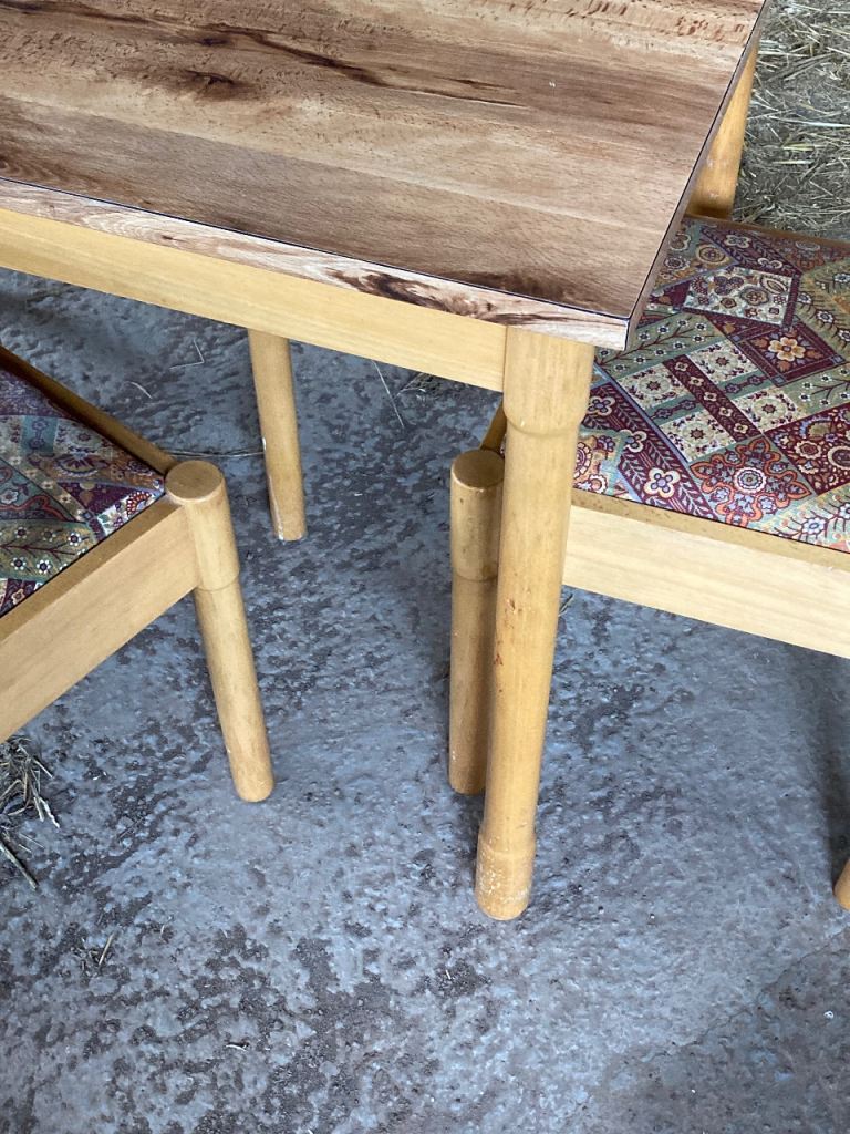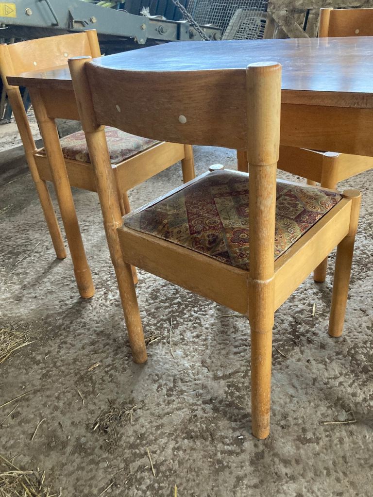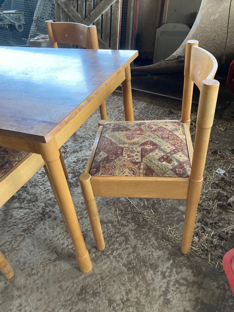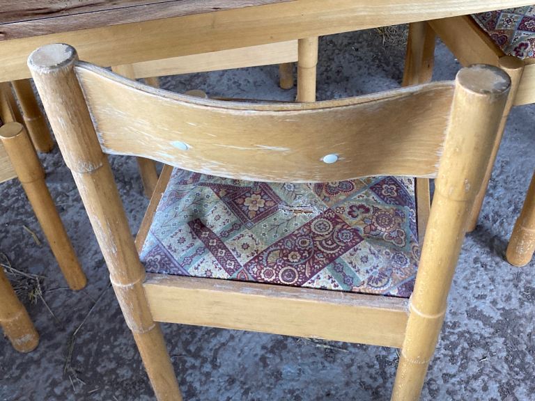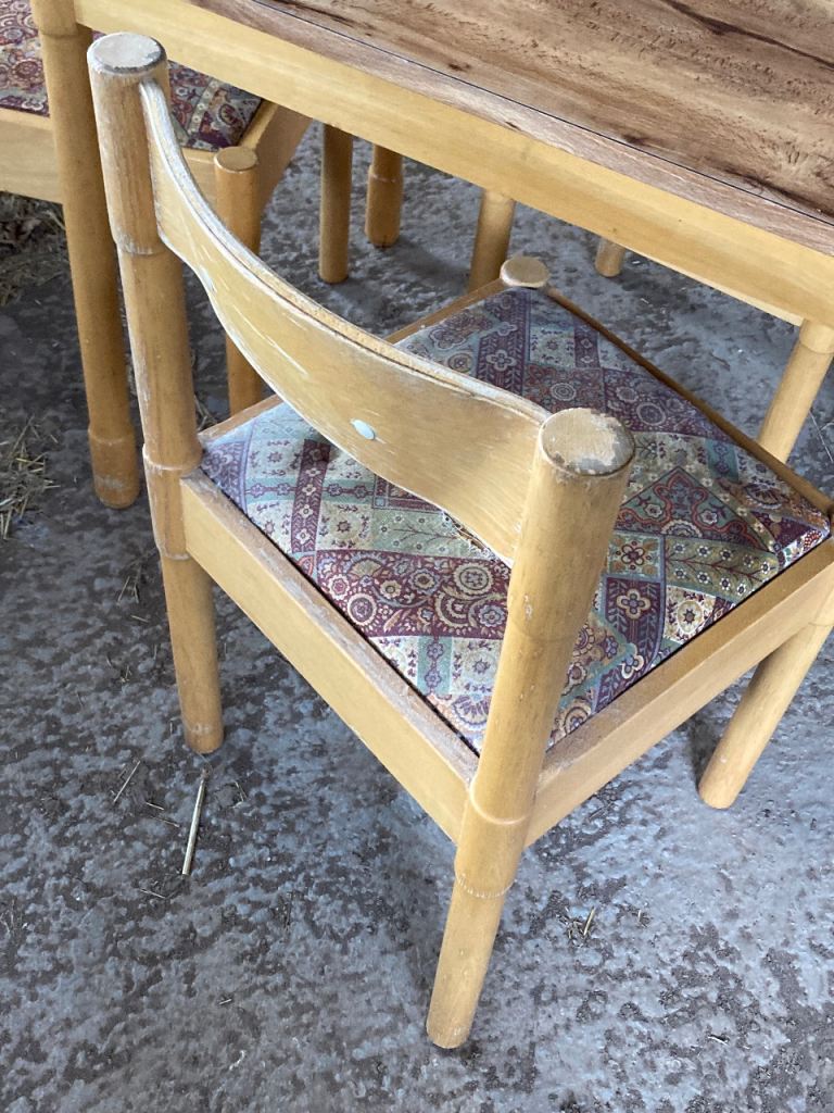 Seats- light beech colour wood with curved back and 2 white buttons inlaid. Totally solid. Removable seats so you can easily change the fabric to suit your style. Chairs and table legs need a sand down and light varnish to bring them back to life. 1 seat has a rip in the fabric. Others are fine