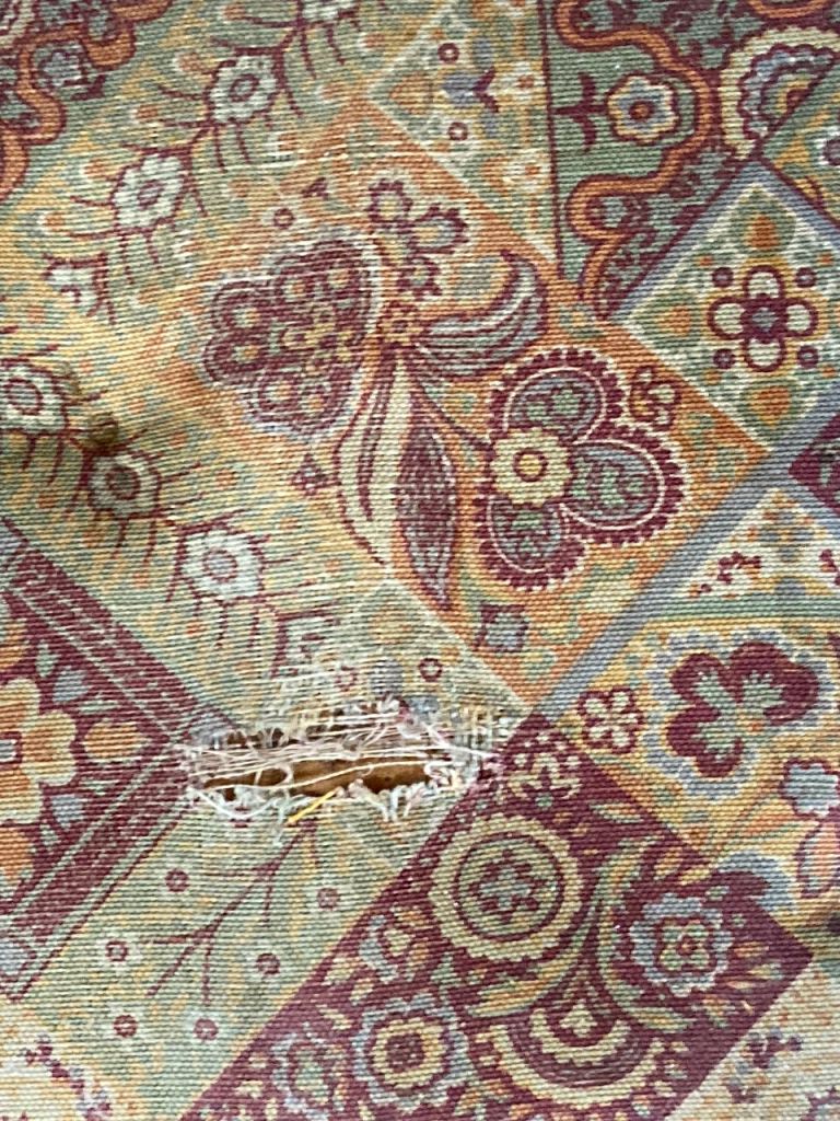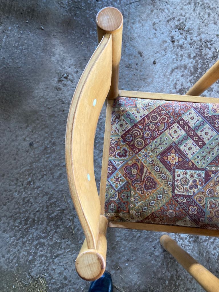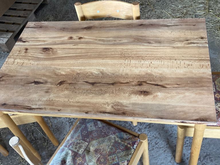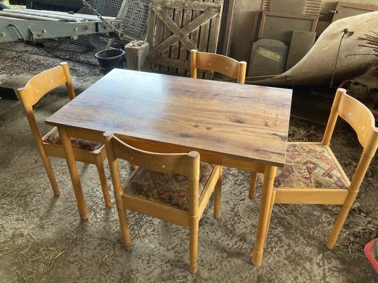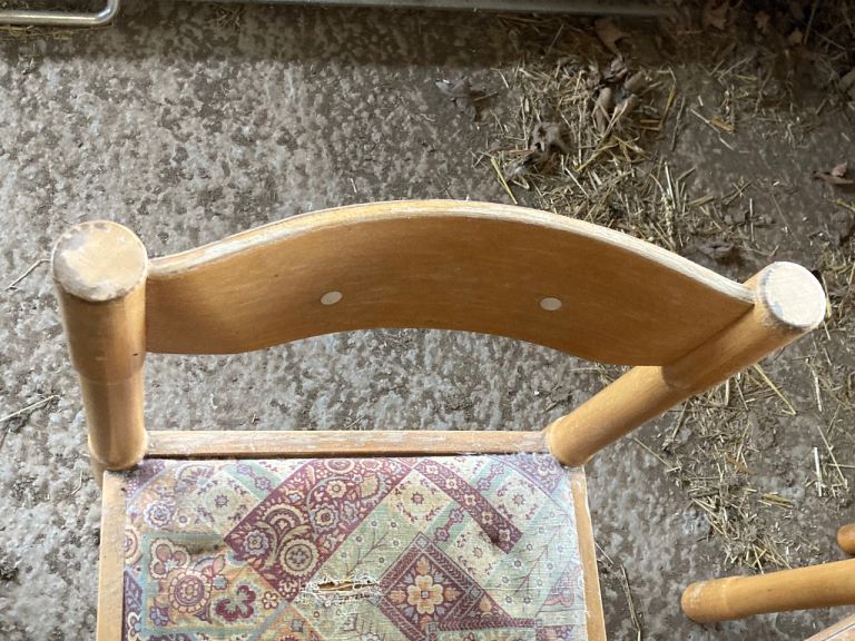 Seats- light beech colour wood with curved back and 2 white buttons inlaid. Totally solid. Removable seats so you can easily change the fabric to suit your style. Chairs and table legs need a sand down and light varnish to bring them back to life. 1 seat has a rip in the fabric. Others are fine
