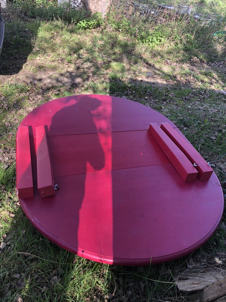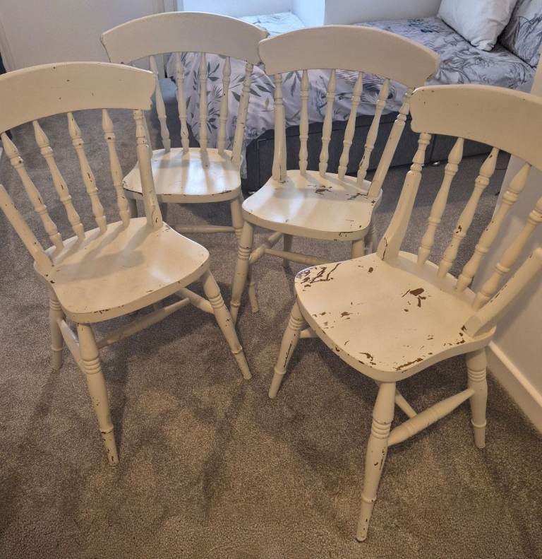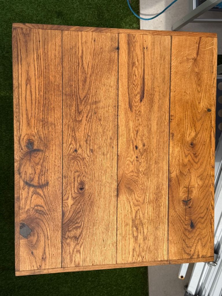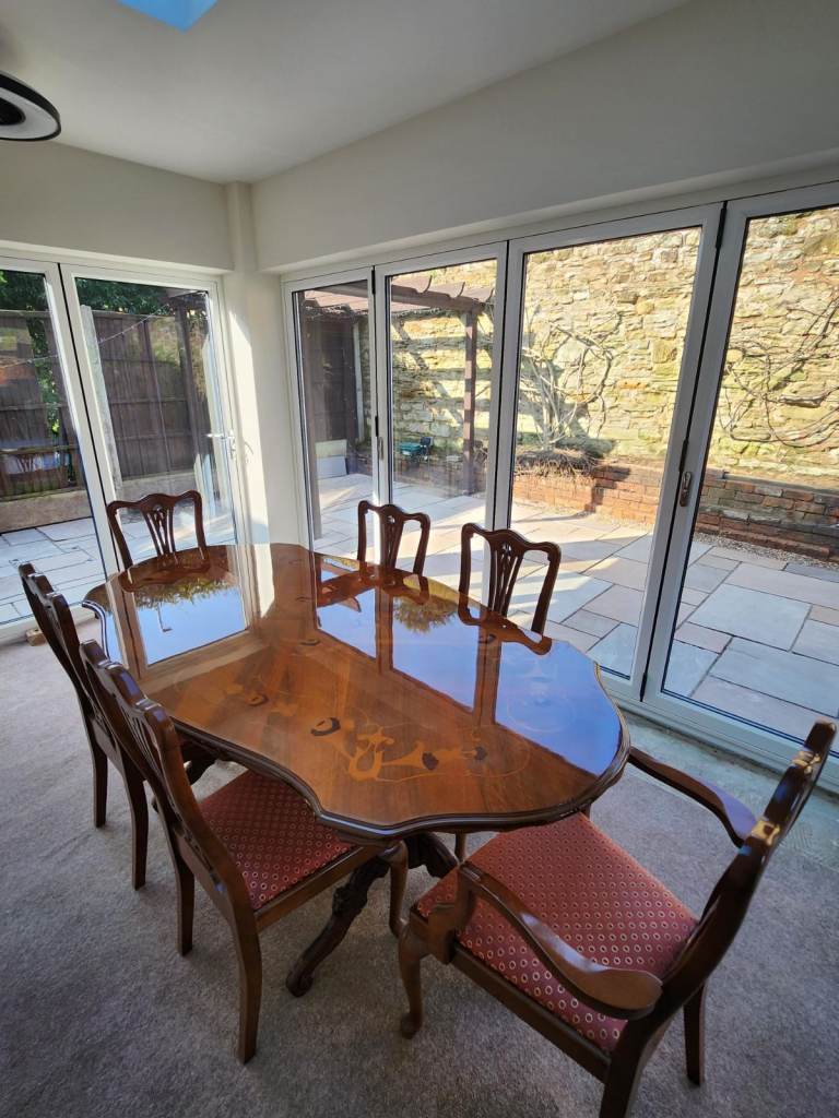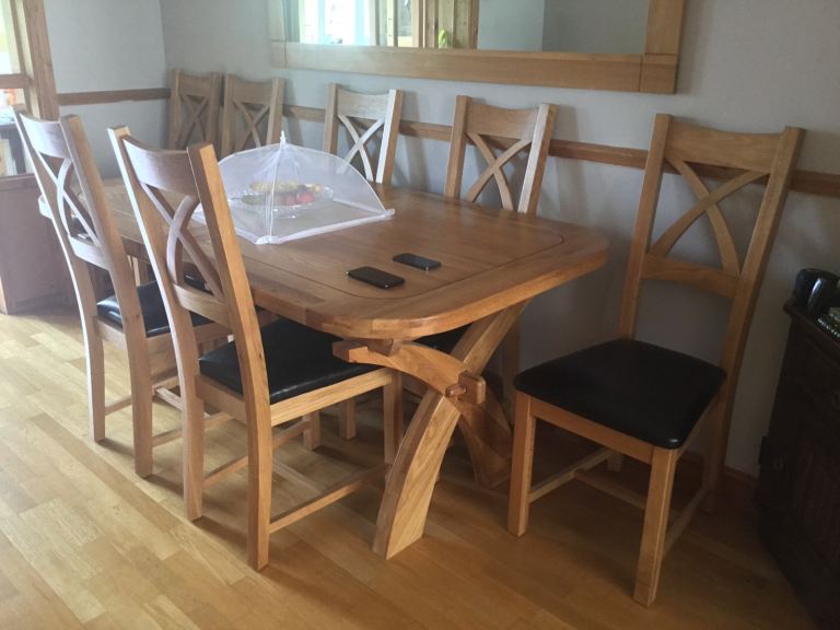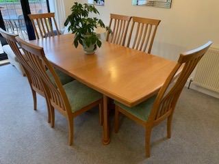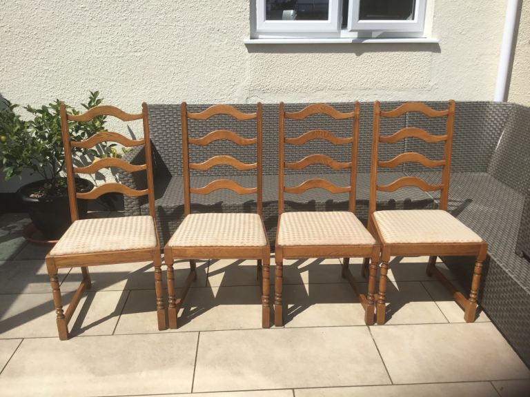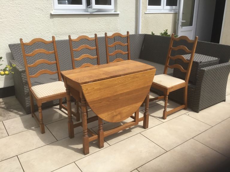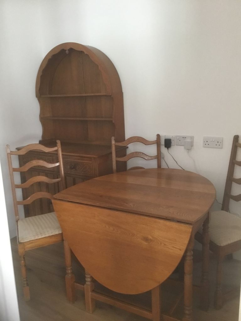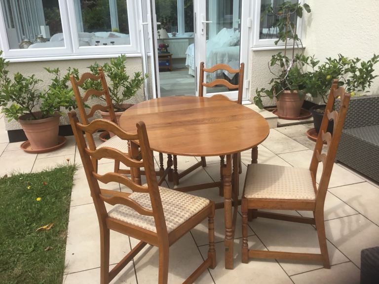 Vintage solid oak oval drop leaf gate leg table with 4 matching oak chairs. The dining set including dresser has been in our family for over 50 years and has been used continuously. Sadly due to move cannot find space for it now.