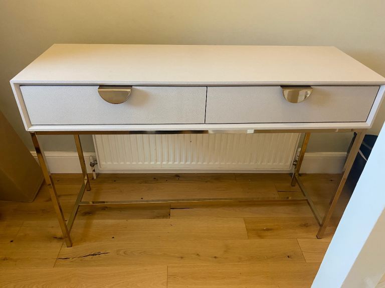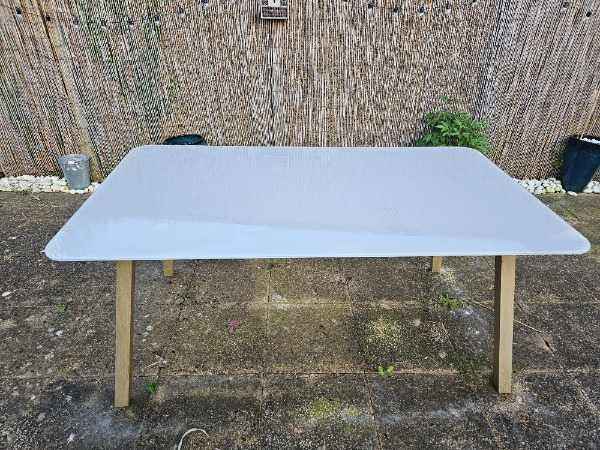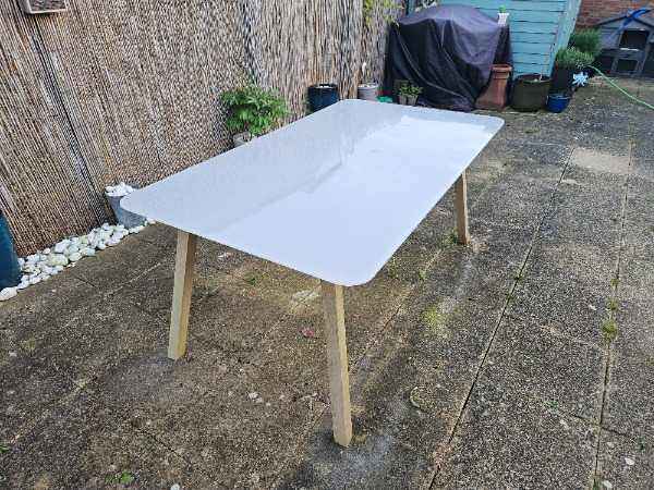 White glass dining table with metal frame and legs. Superb condition (you would think it was almost new). Beautiful white glossy glass (you'd have to see it in person to appreciate it more). Very heavy. Already dismantled and ready for collection. Easy to assemble.
