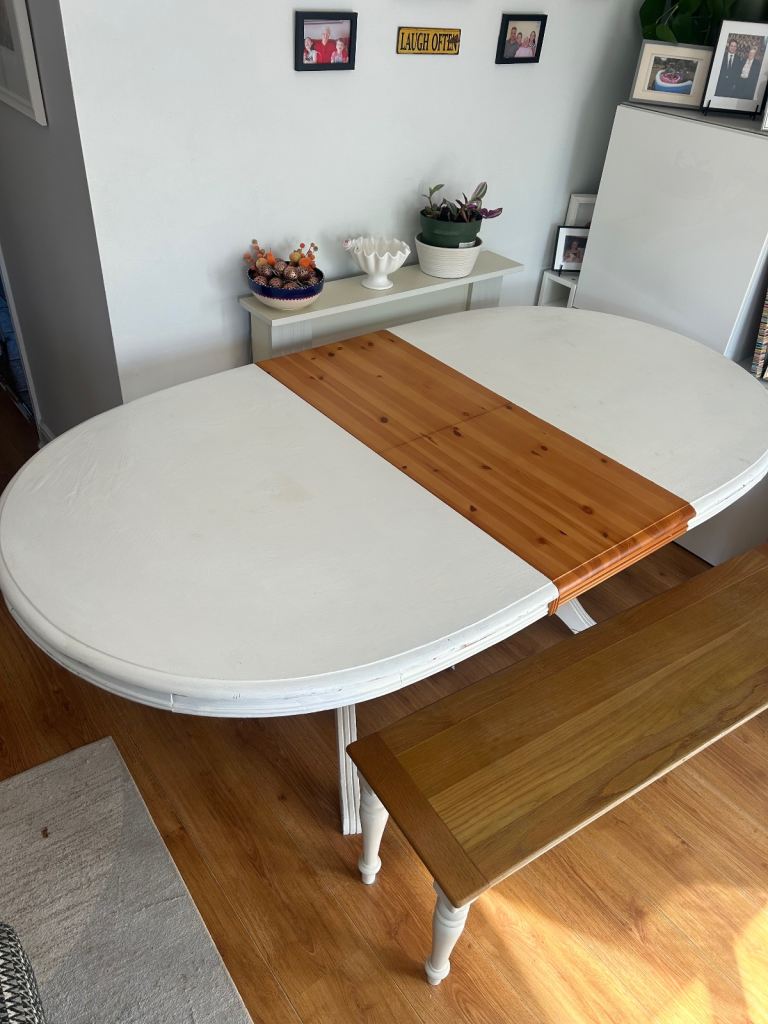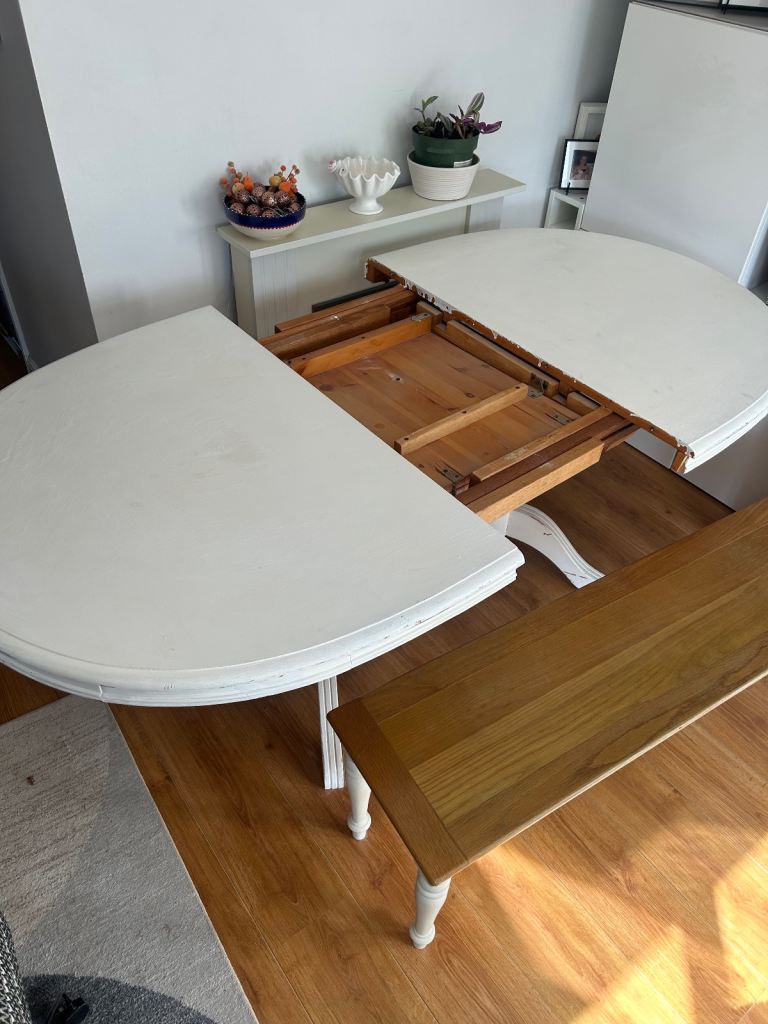 Wooden extendable dining table (unfinished project) needs sanding back and repainting or a nice table cloth.