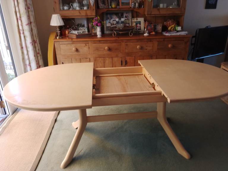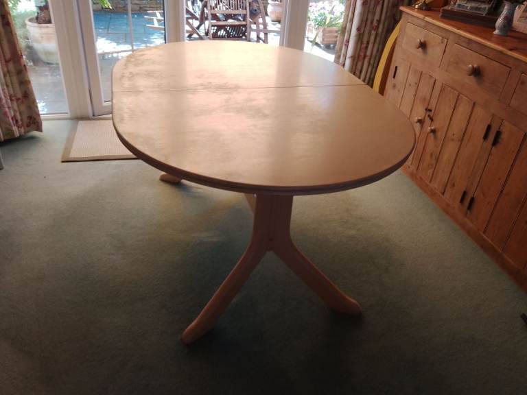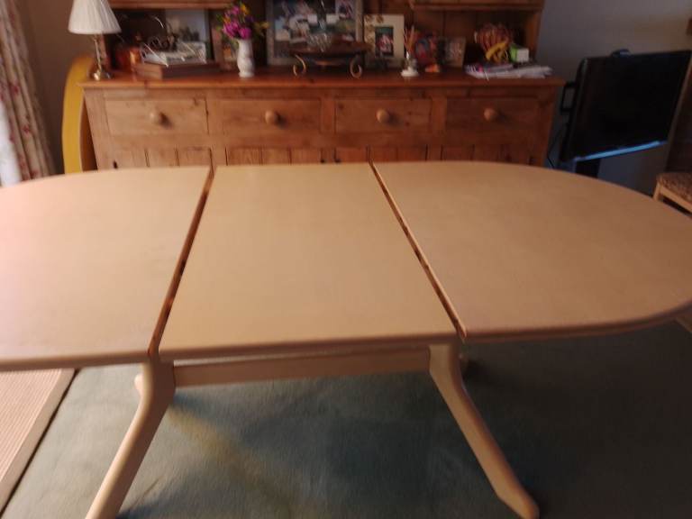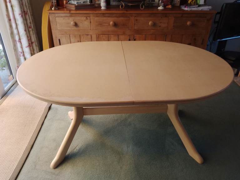 Cream coloured extendable dining table. Sits 6-8 people comfortably. Would benefit from a repaint.
