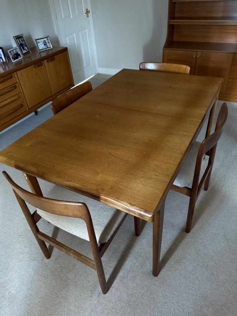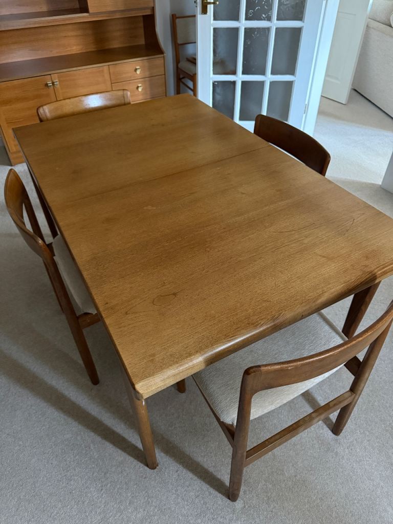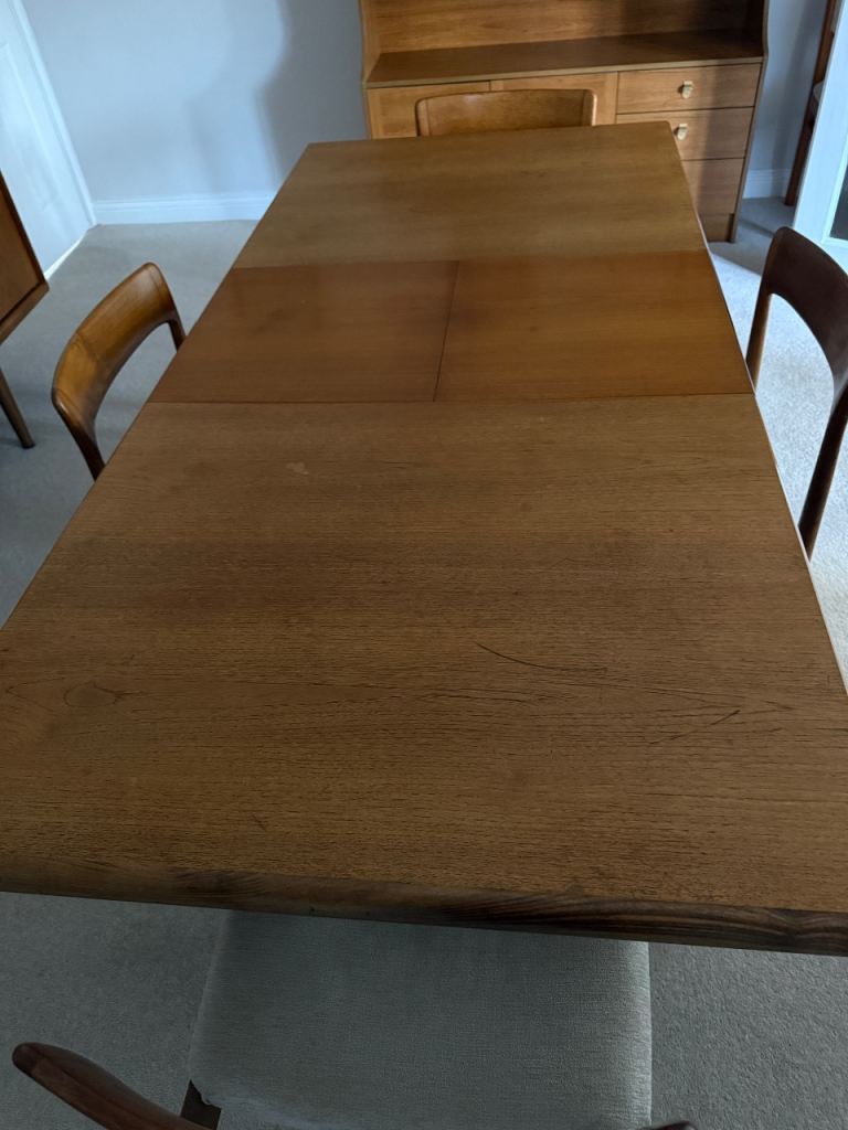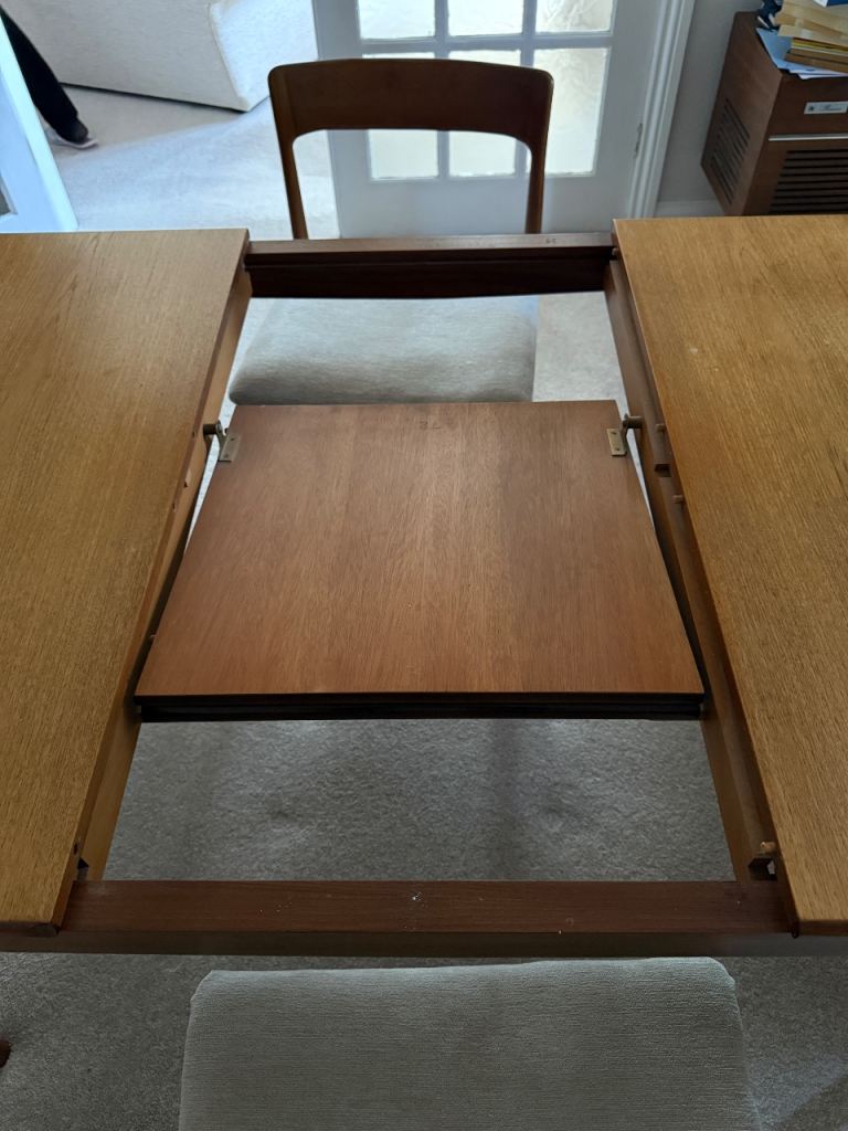 Dining table manufactured by youngers and 4 chairs. Teak solid wood. Legs do not remove.