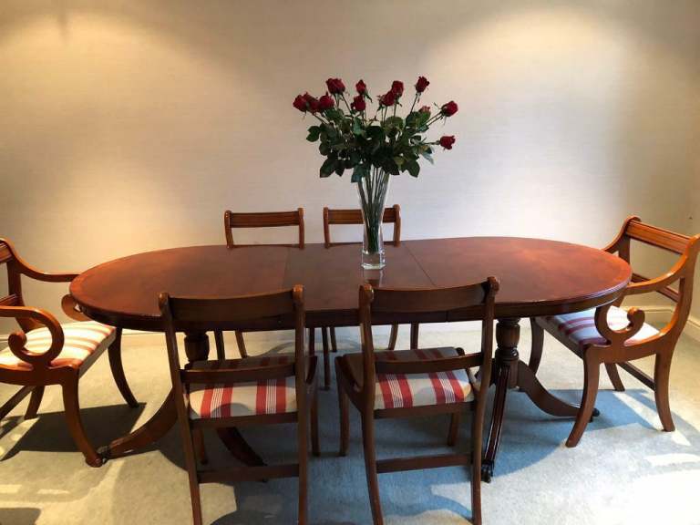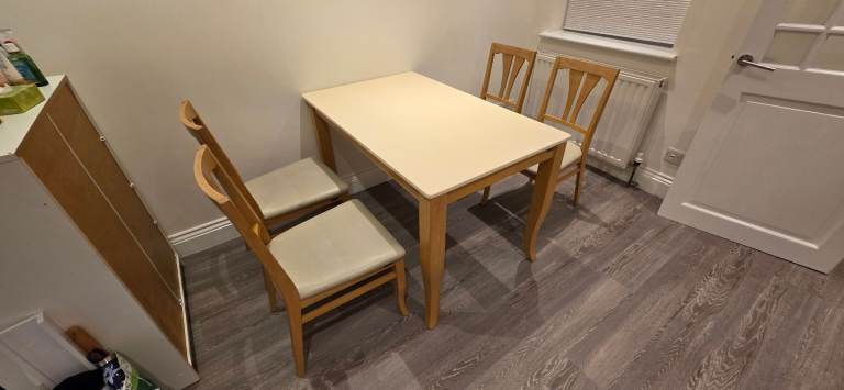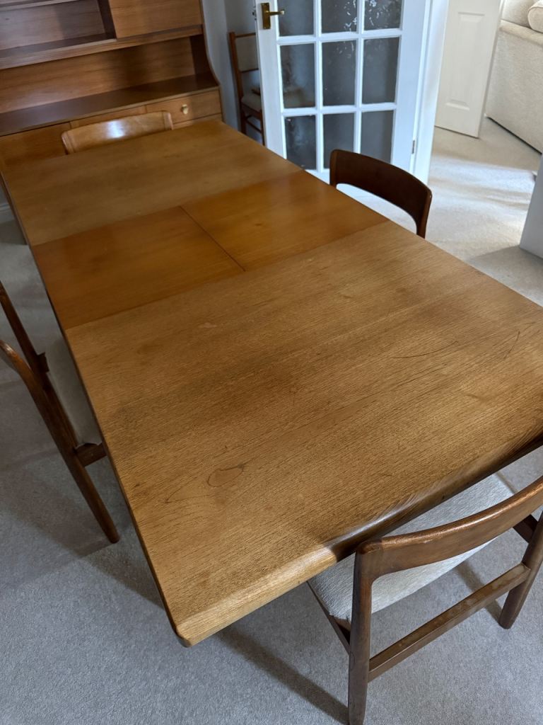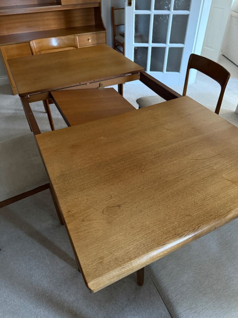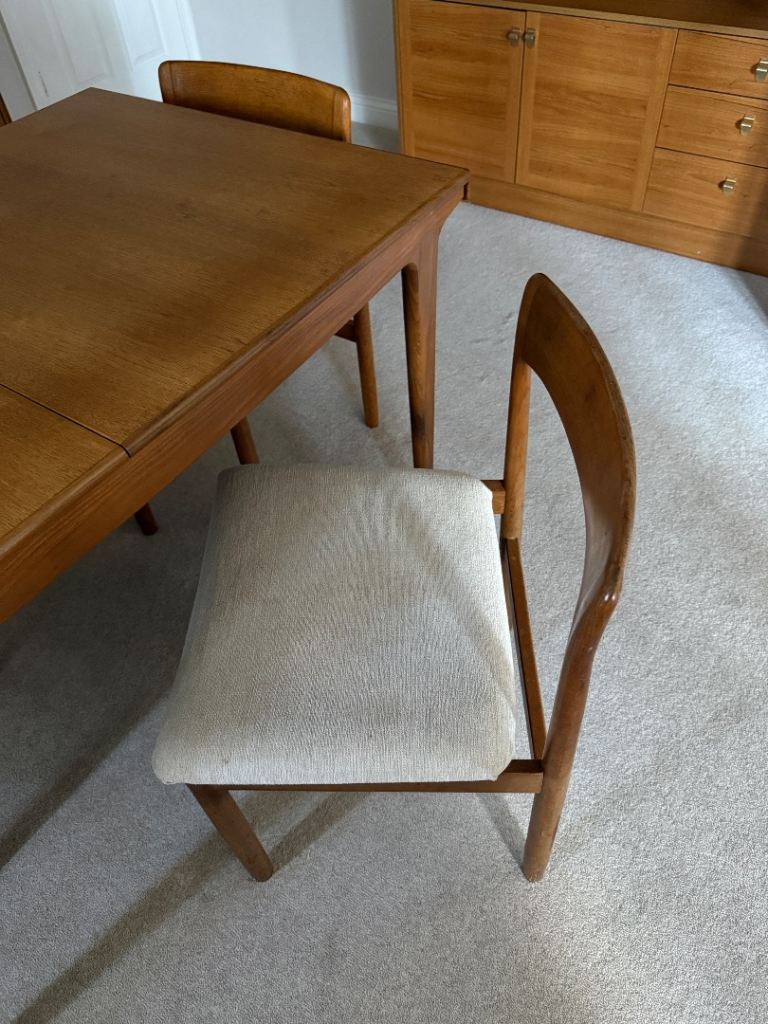 Dining table manufactured by youngers and 4 chairs. Teak solid wood. Legs do not remove.