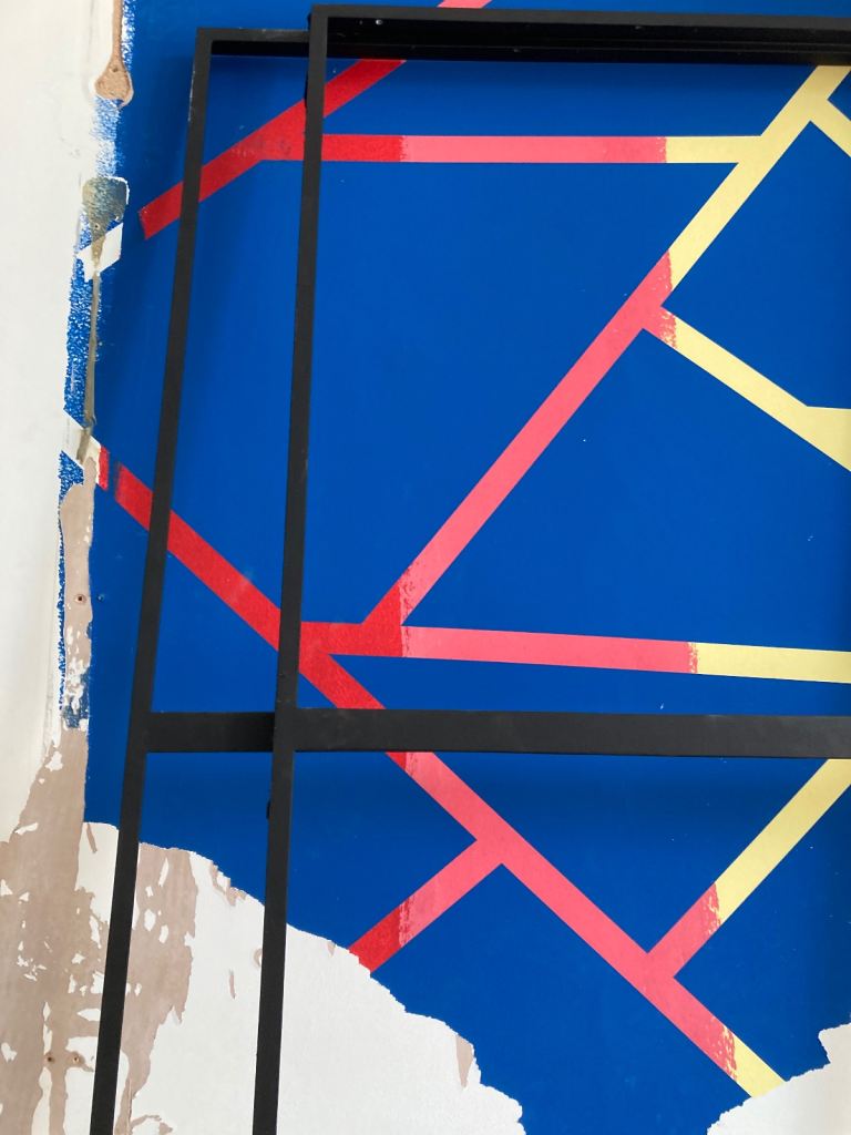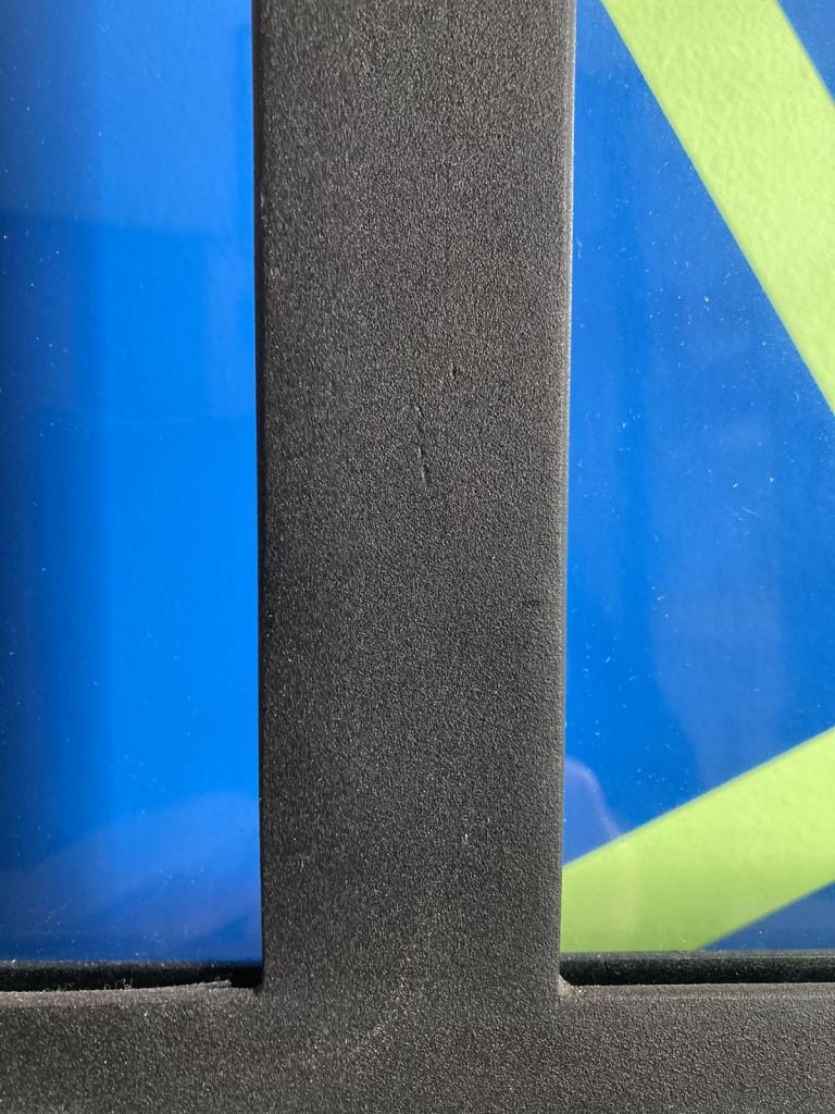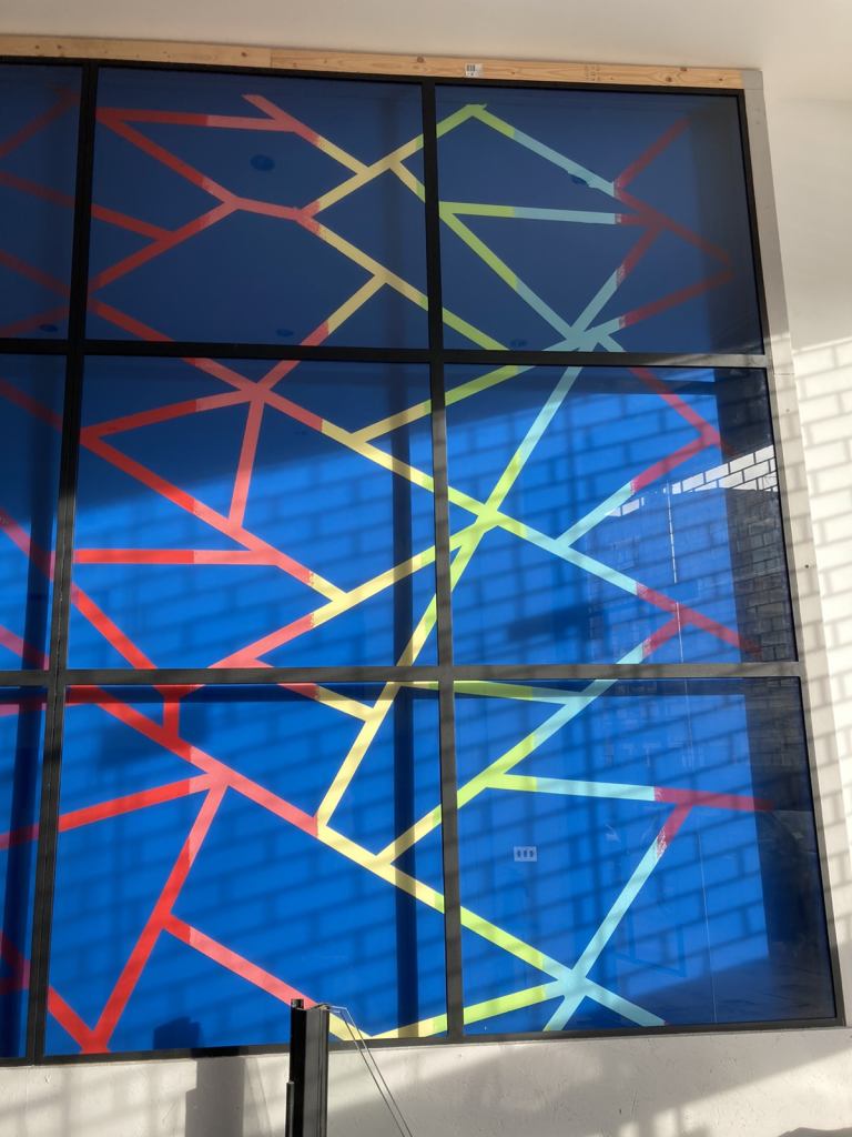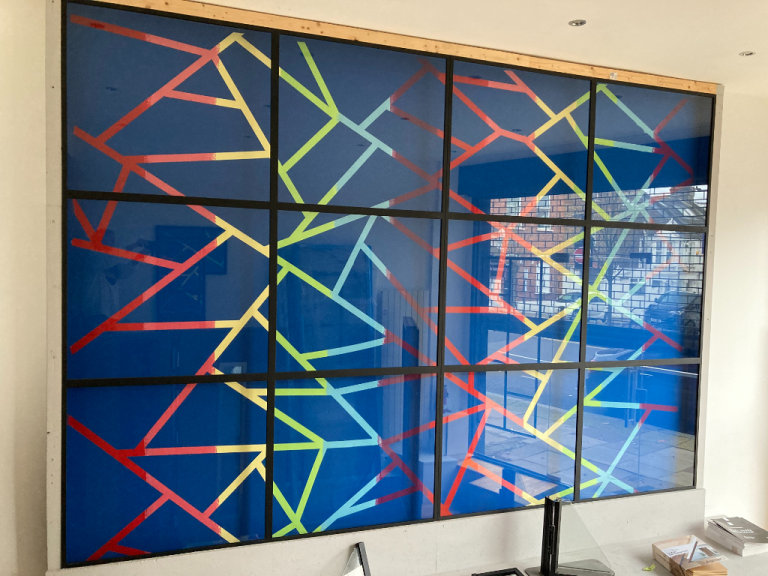 Suitable for the home and the work place, this large partition has been mounted on the showroom wall in front of a coloured background, the frame is black and the glass is clear.