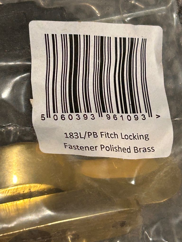 A job lot of polished brass Fitch locking fasteners and sash eyes, all brand new.