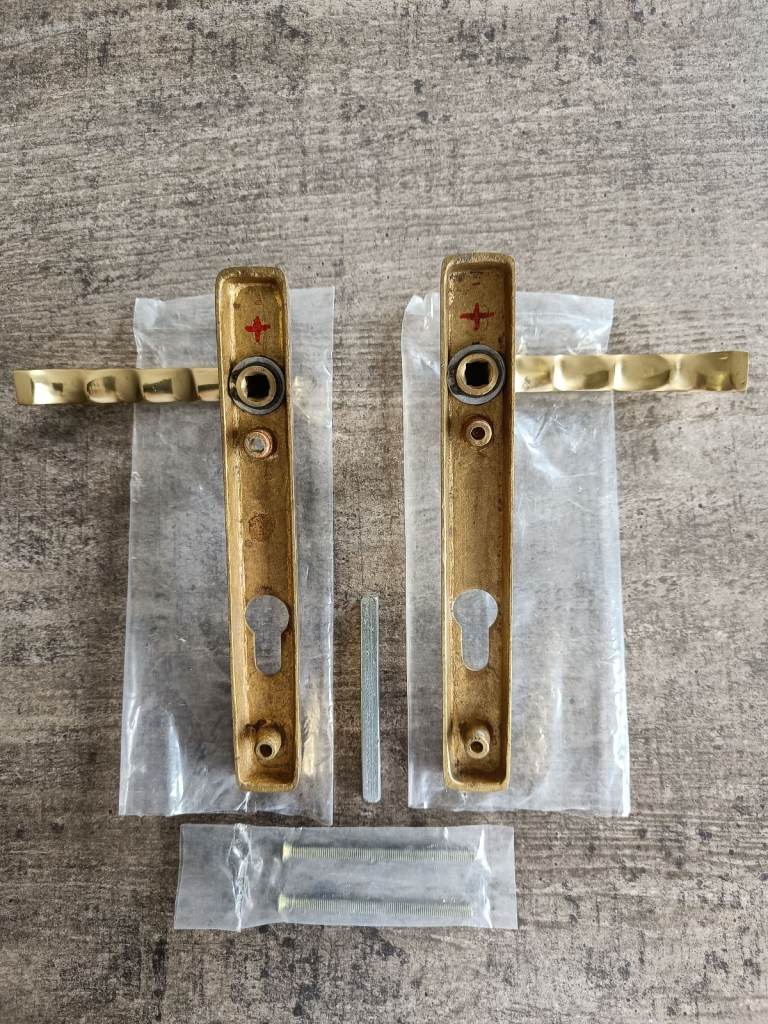 New solid brass door handles, Gold looking finish, heavy very well made handles, Secure by design, for use with PVCu, composite, timber and aluminium doors, suitable for multipoint locks. cost £65 new.