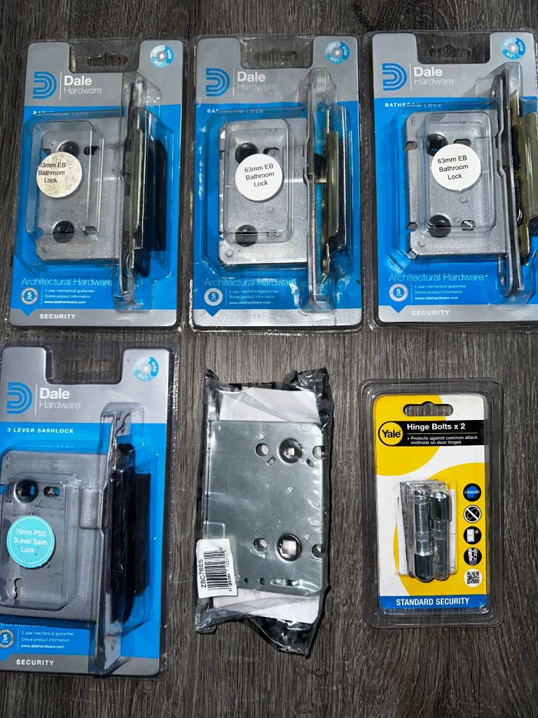 4 x bathroom locks, 1 x 3 lever sash lock and 1 pkt hinge bolts worth £40