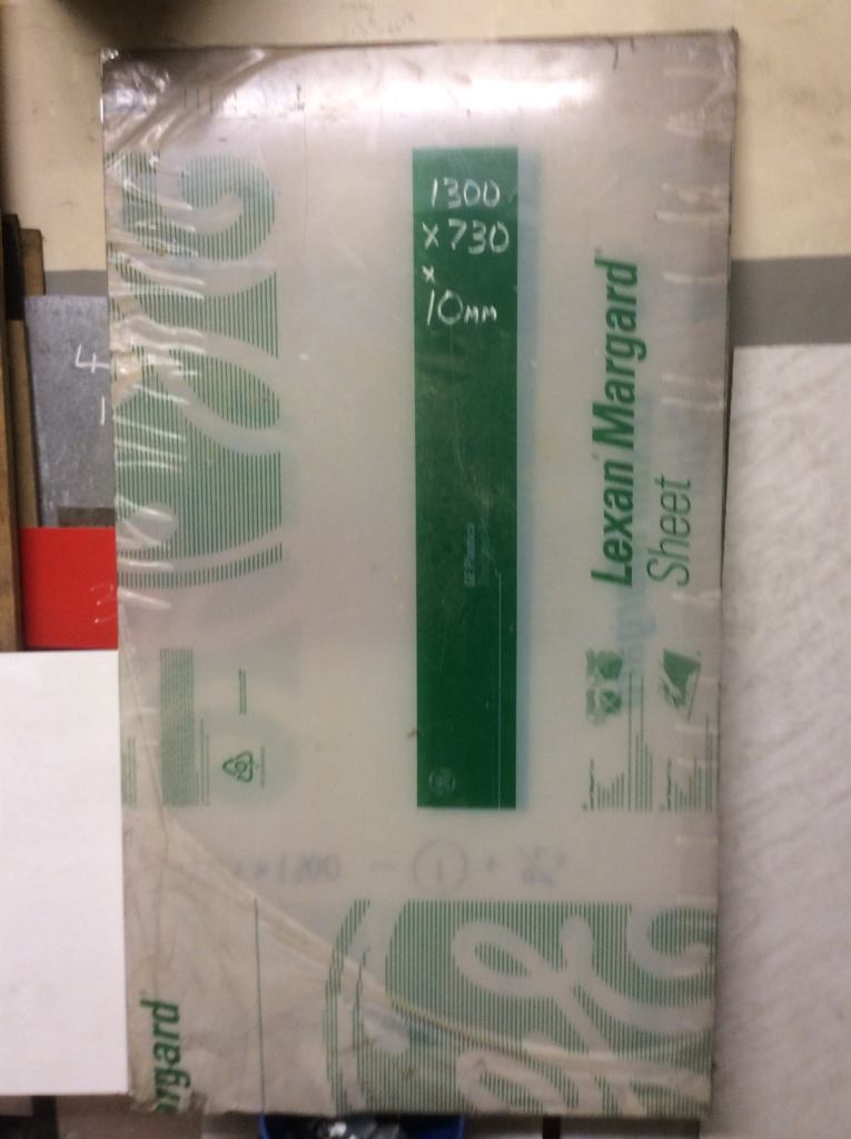 This could be the ultimate in security glazing, being,— LEXAN MARGARD, polycarbonate sheet, is near indistructable through impact, size is,- approx 1900 x750 x (to be confirmed) x10 mm thick, no problem with insurance with this, check out the current price, makes this a bargain. This is unused stock.