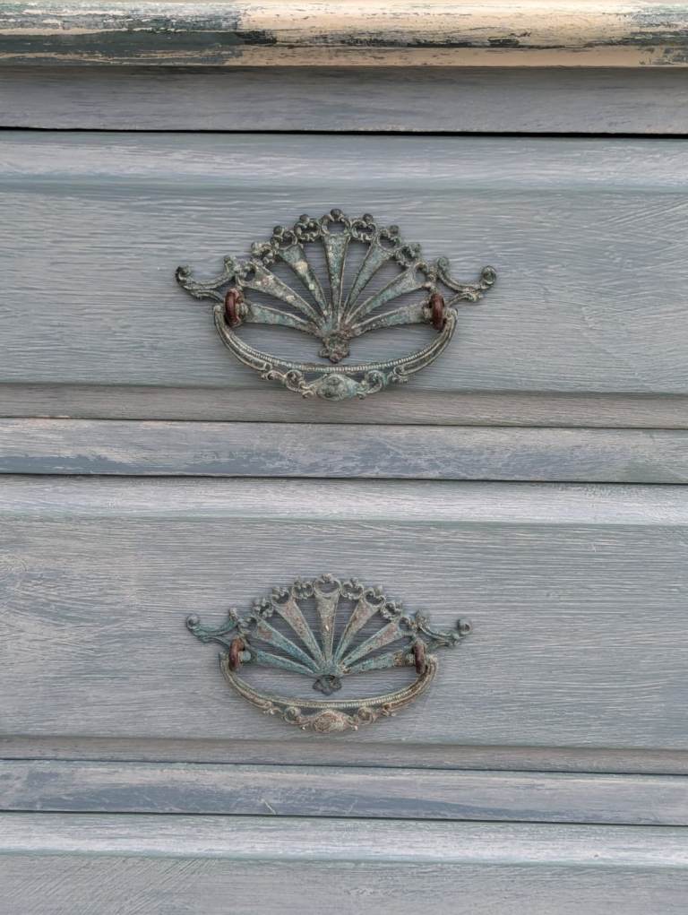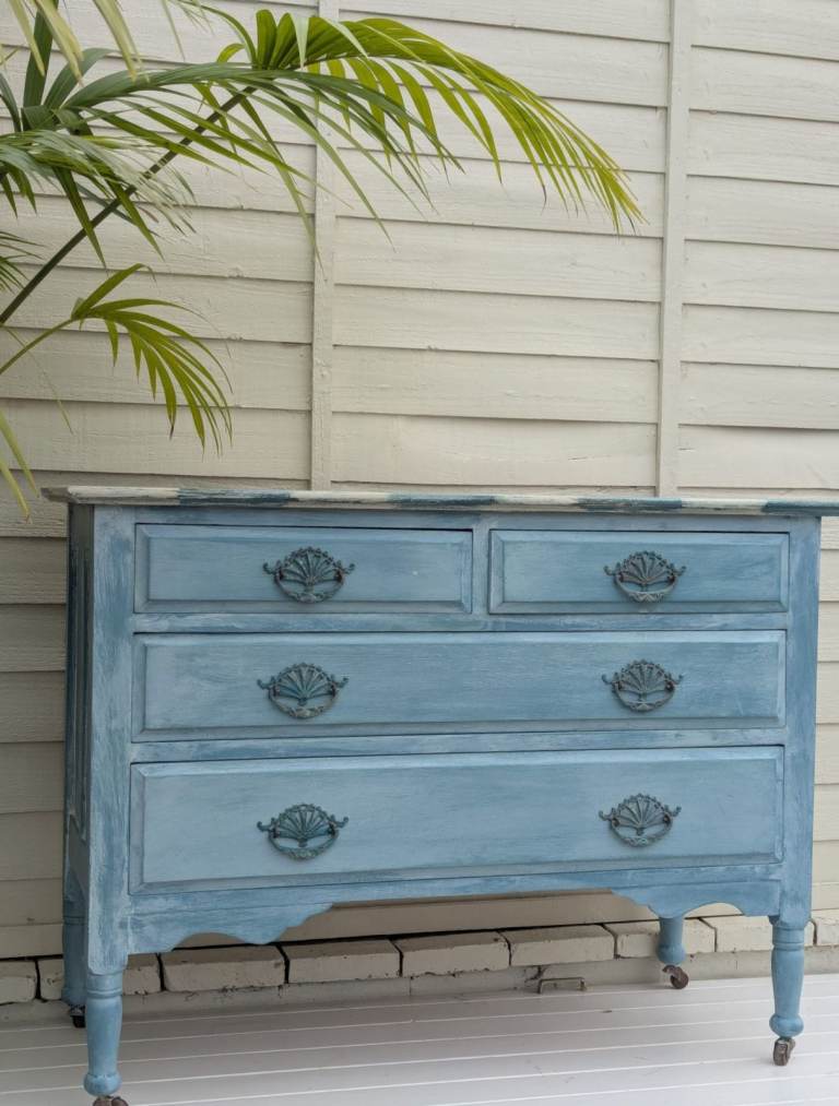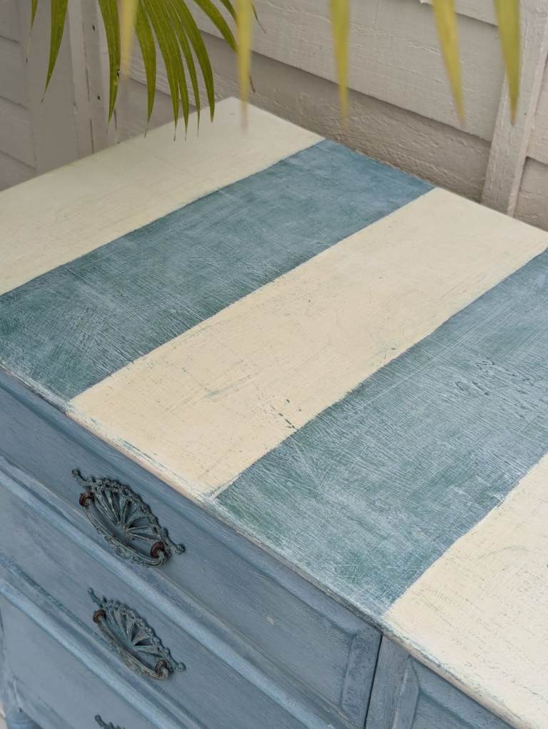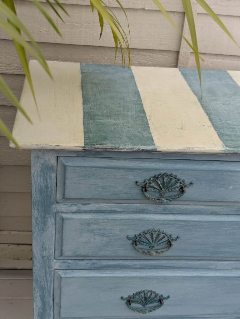 Antique Coastal Blue & White Chest of Drawers. These make a lovely statement piece to freshen up your space. These drawers have their original castors and handles which have a lovely patina. The drawer interiors have been painted in a complimenting dark green eggshell. Dimensions 108w x 80h x 46d cm. £100. Scothern LN2