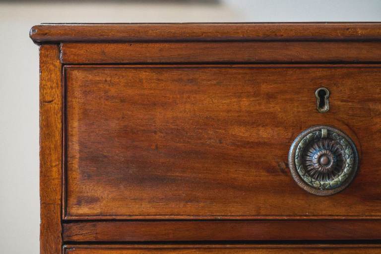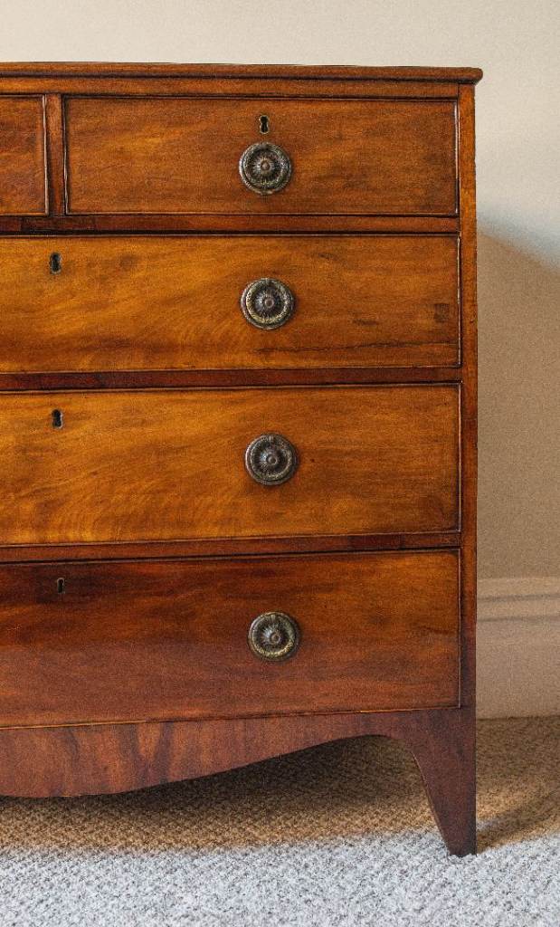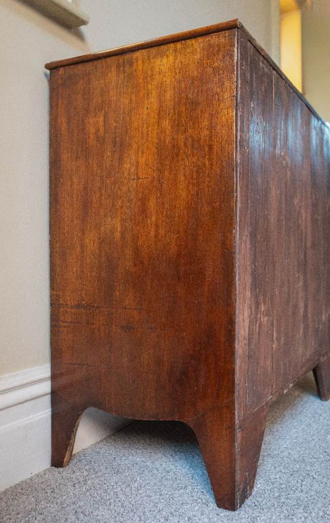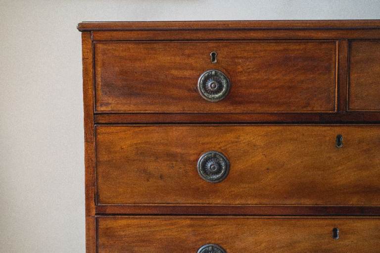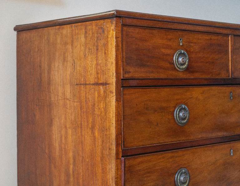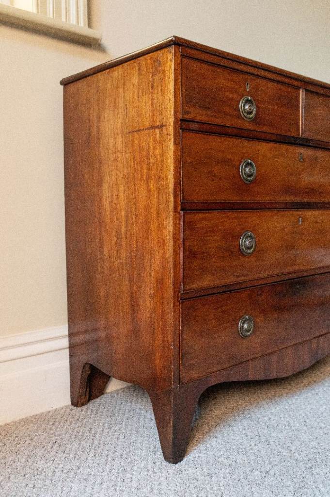 Georgian (c. 1820) mahogany chest of two short drawers over three graduated cockbeaded drawers fitted with pressed ring handles. As it’s commonly found on chest of drawers of this age, the handles are not original and were replaced at some point, though they are sympathetic to the period, and I think they look quite smart. The drawers are raised on splayed-bracket feet with a shaped apron.