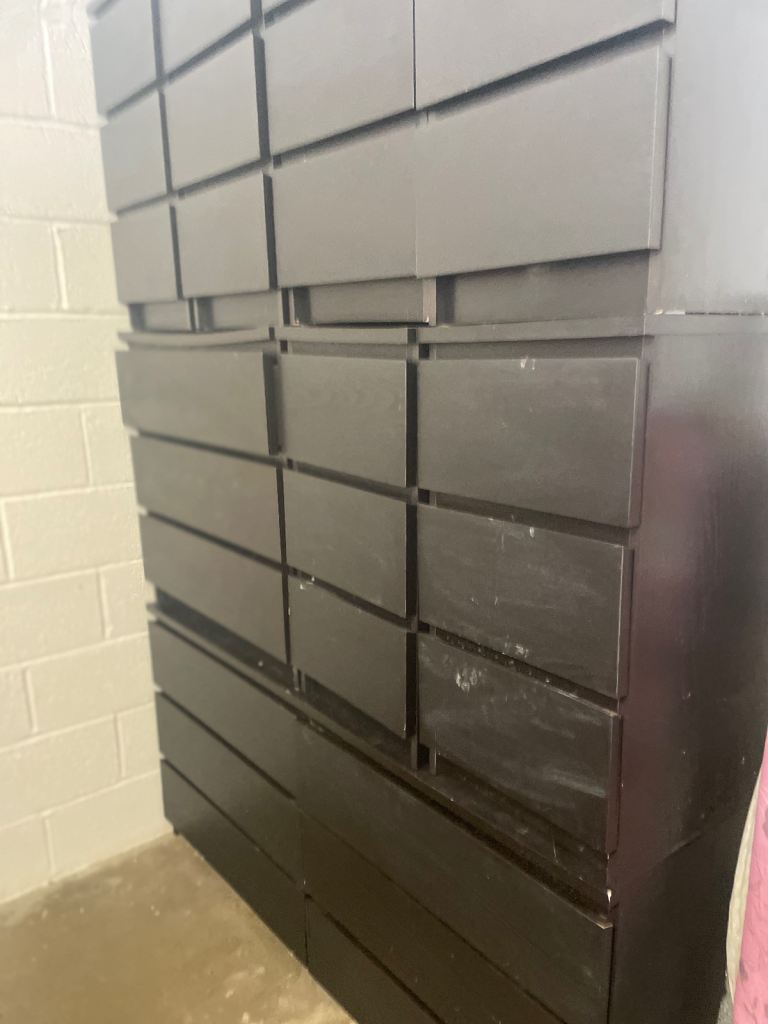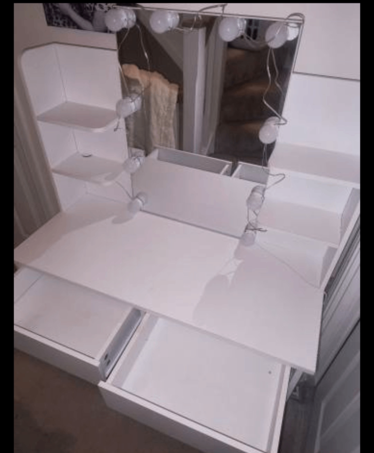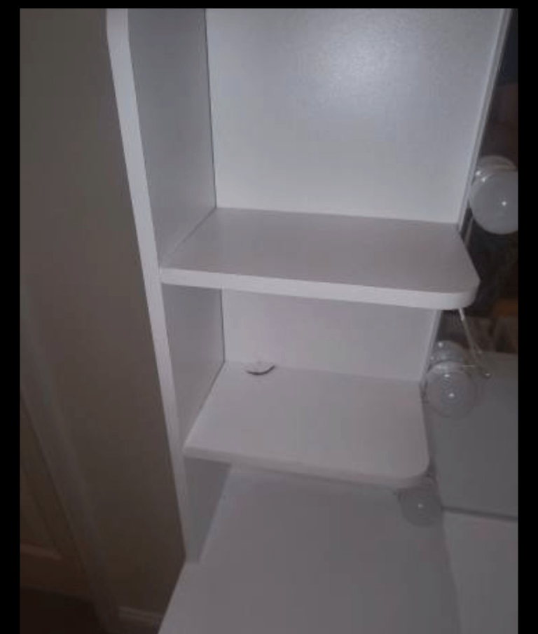 Dressing table with two drawers and shelves for sale less then a year old small chip on one of shelves (as seen in pics) doesn't affect use ...lights are an extra we added on and have run out.. but can be purchased off amazon for £10