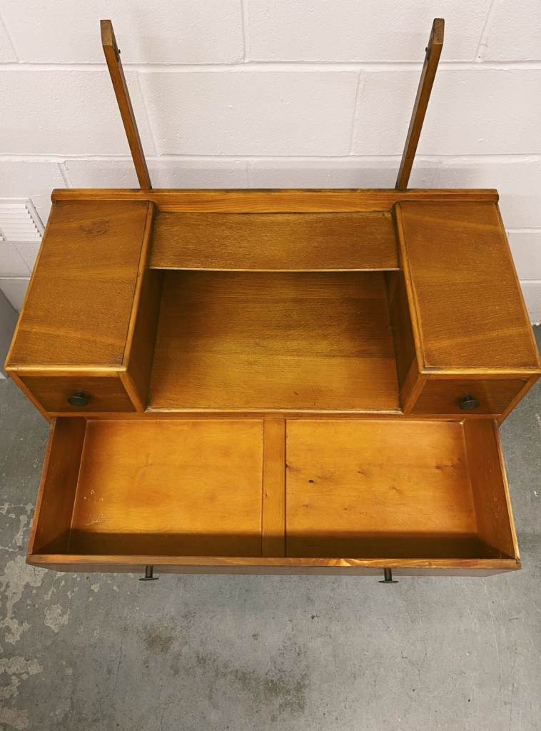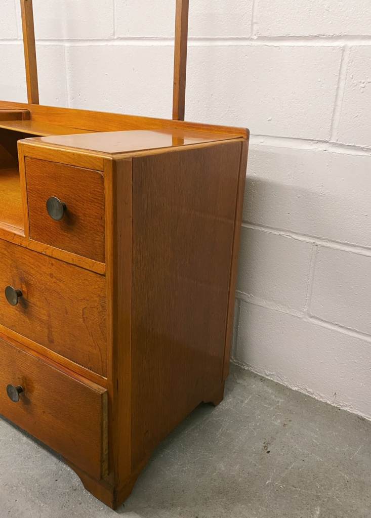 It is a sturdy functional piece, has a tilting mirror, although with the age there is some degrading/rusting to the tilting joint that will need some attention to get the desired angle and has good depth to the drawers for storage, with the two smaller drawers for makeup etc to either side of the resessed top. This section also has a thin shelf for display items.