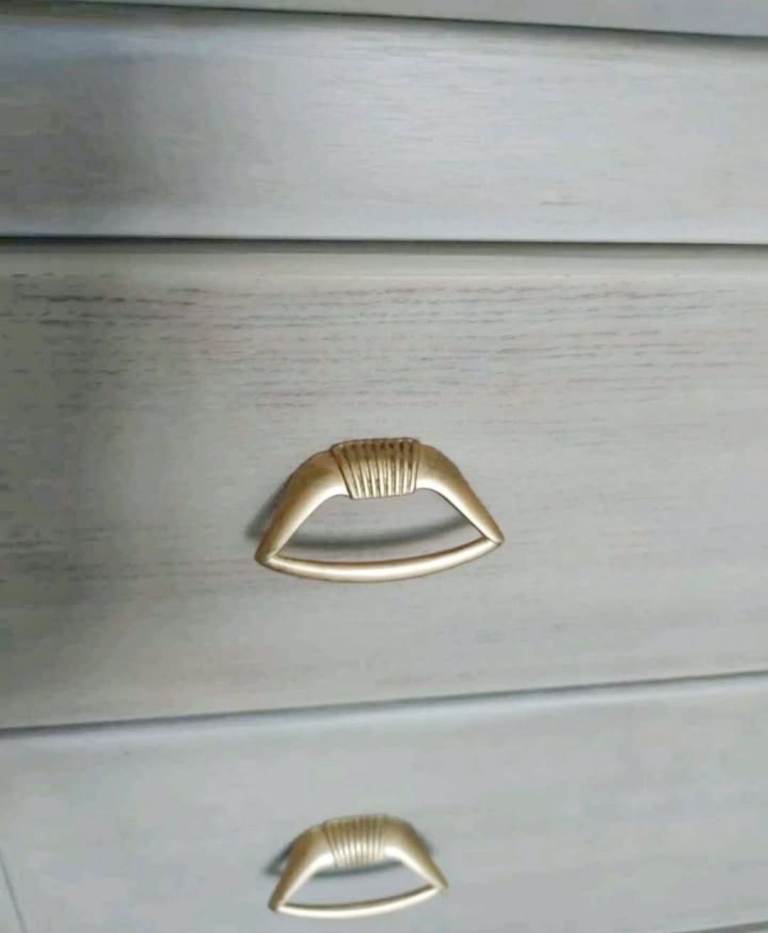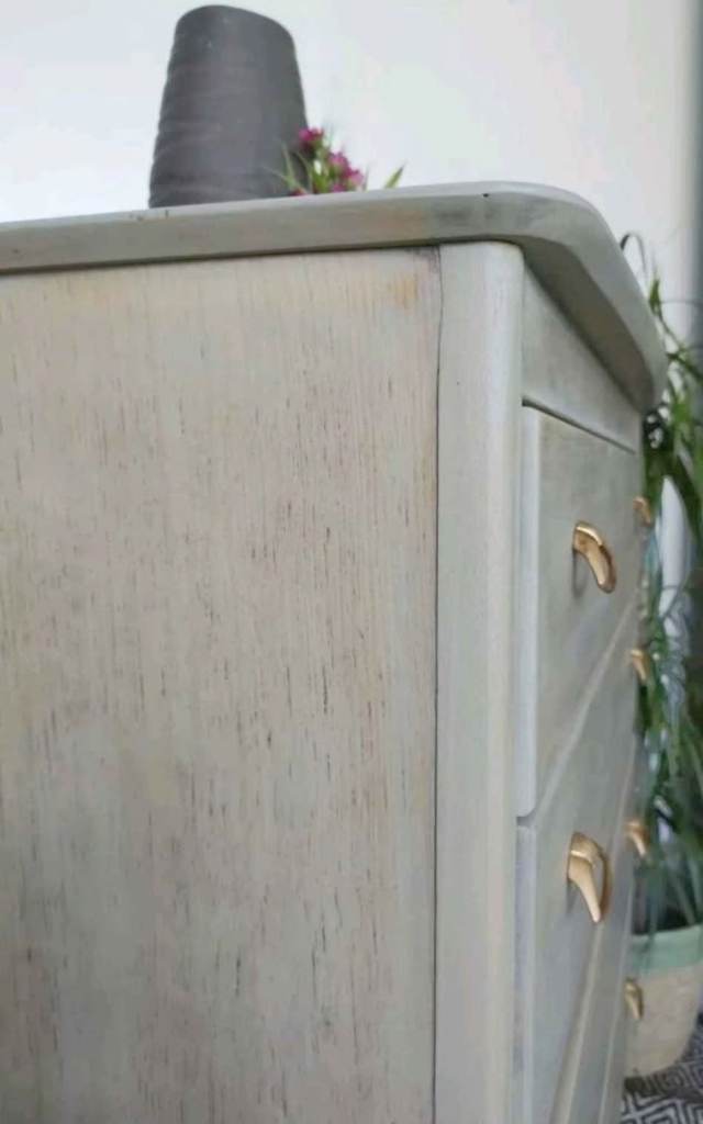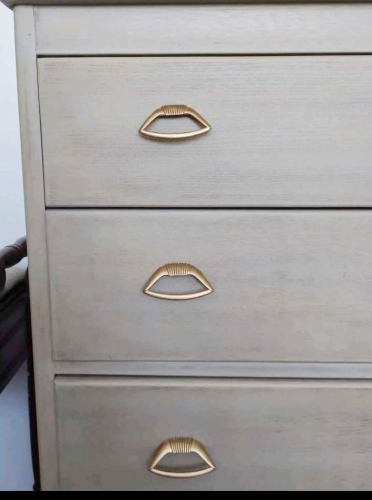 A beautifully finished vintage-style chest of drawers from Lebus. Cleaned, sanded, and paintwashed to give it a nice, light look. Original handles gilded with gold wax.