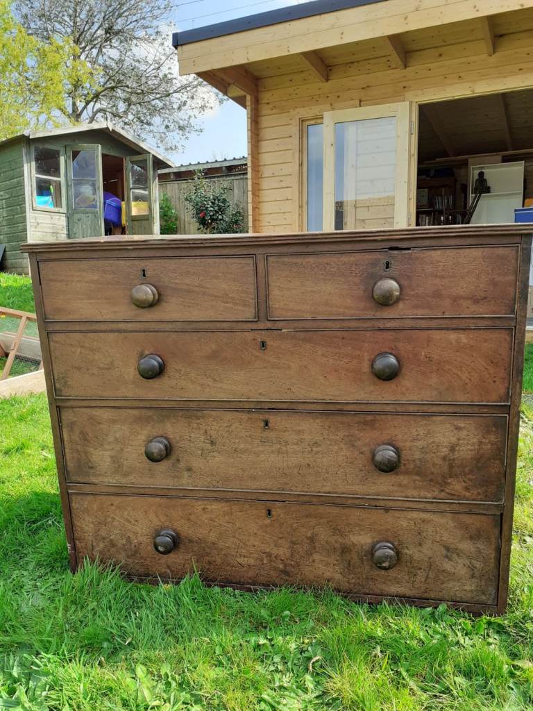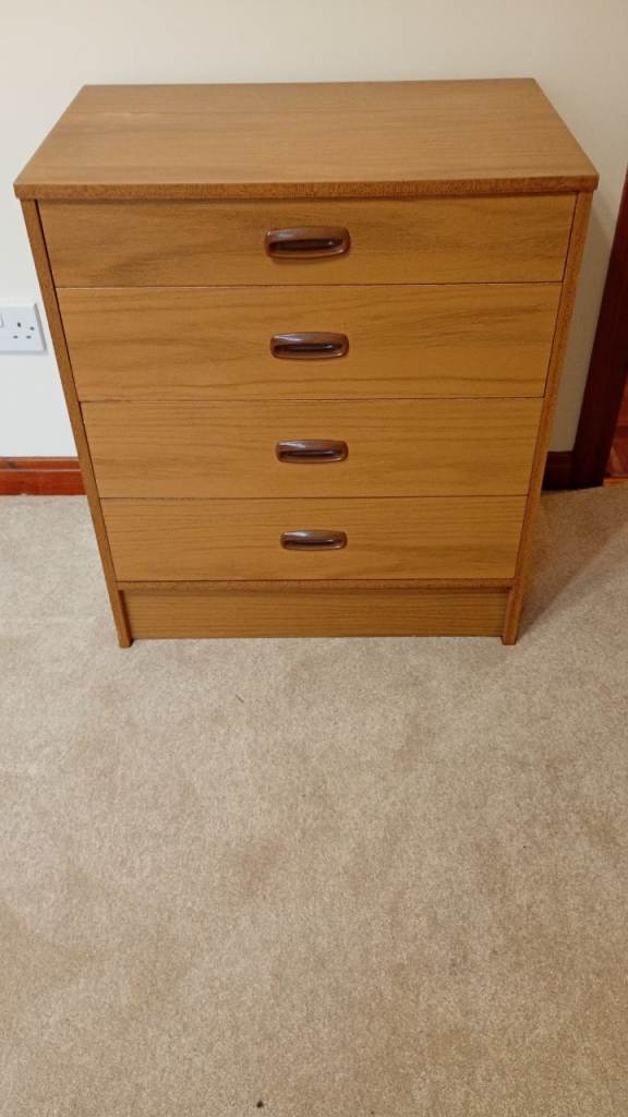 Our pre-owned price is £130 for this Chest of Drawers, a sturdy wood piece with traditional dovetail joints and silver-toned handles, ready to add practical storage and a touch of timeless charm to any bedroom.