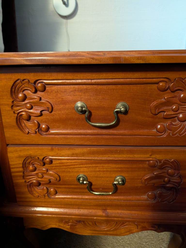 Pair of French Provincial style nightstands. Feature cabriole (S-curve) legs with ball-and-claw feet. The drawer fronts feature deep, symmetrical carvings of floral scrolls and acanthus leaves, with vintage brass bail pulls.