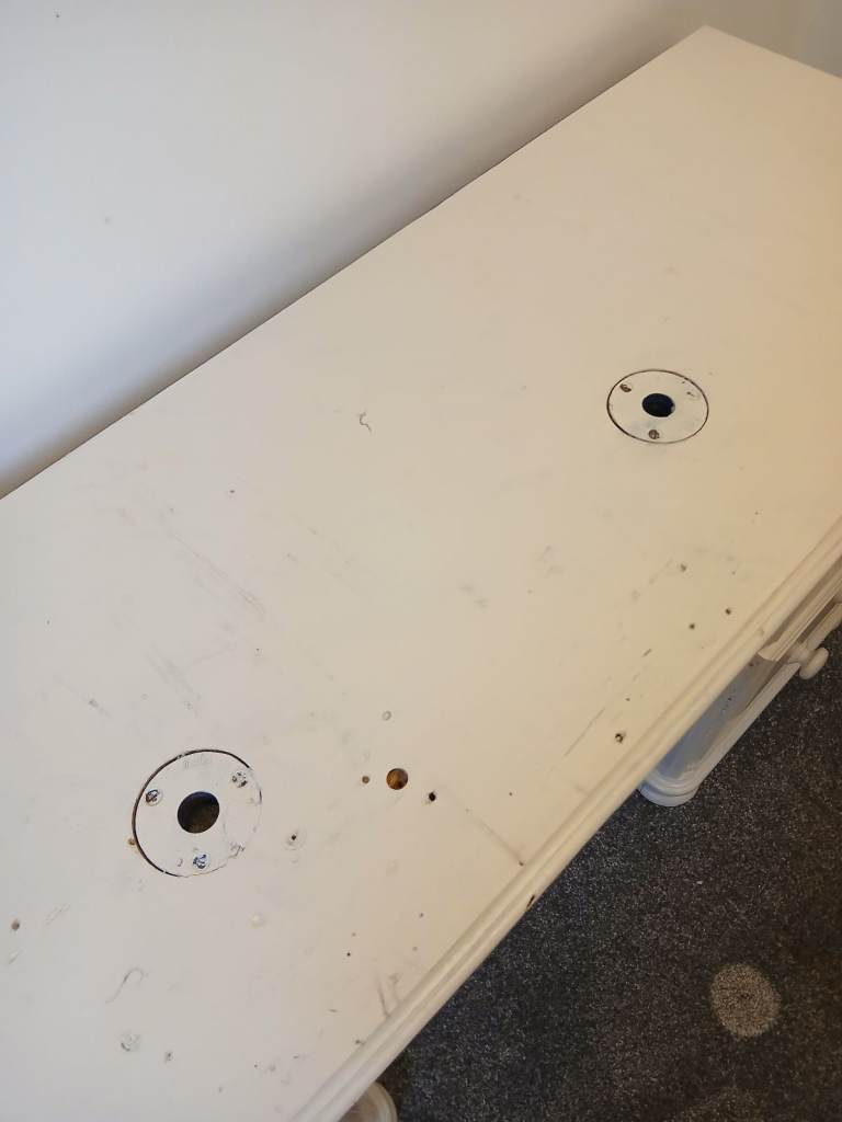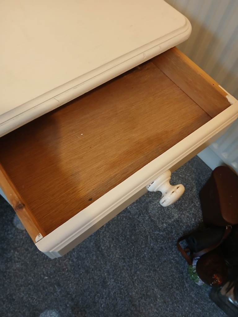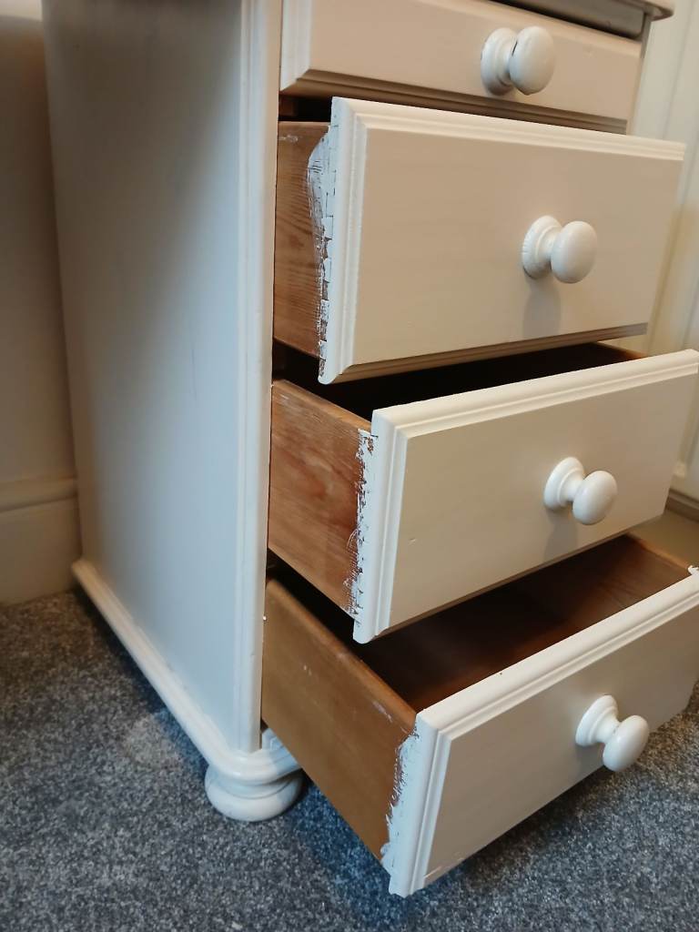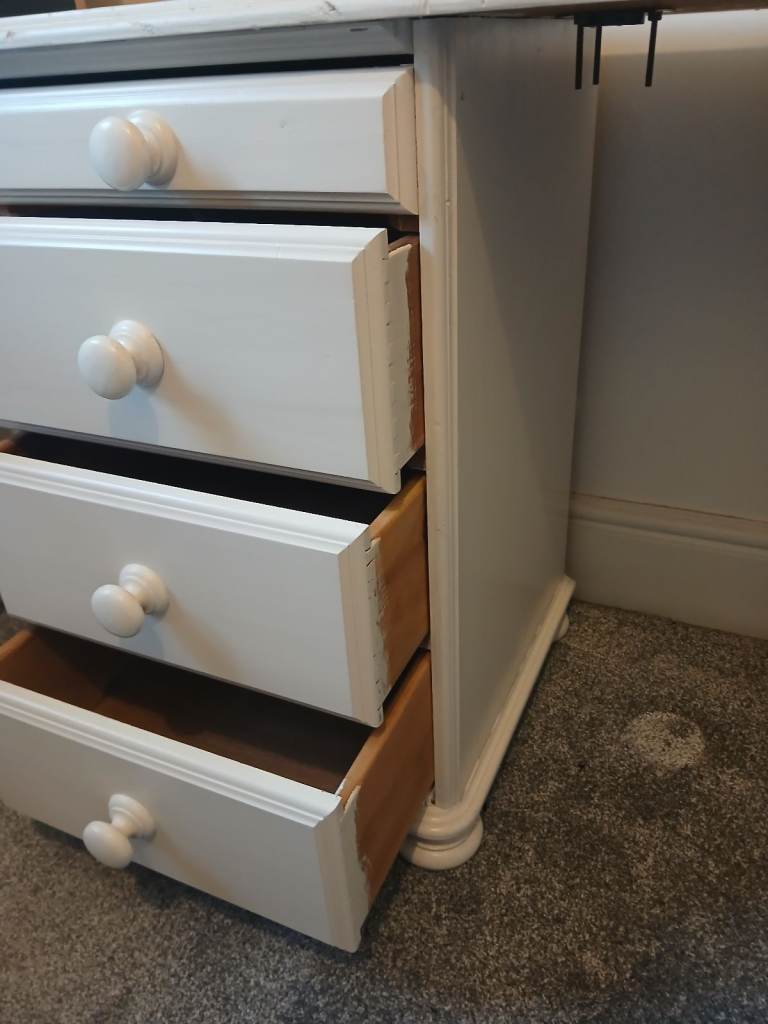 Previously used as a workbench. Has been repainted. All drawers open and close easy.