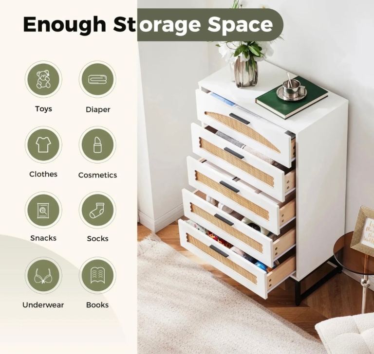 Rattan detail 5 Drawer Dresser Chest with Wooden Frame, Spacious Storage, Modern Handles and Legs - White 61.8x34x102 cm 5D