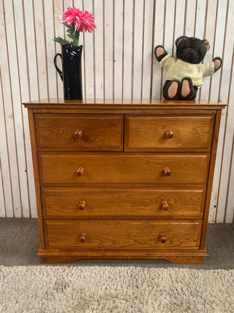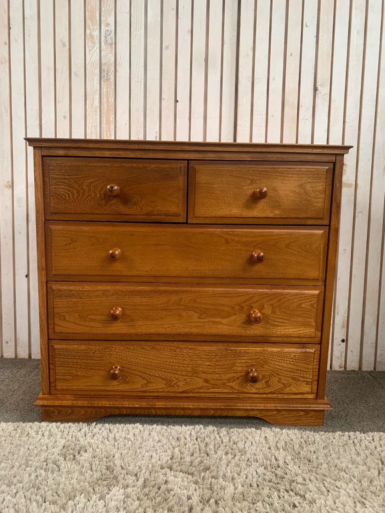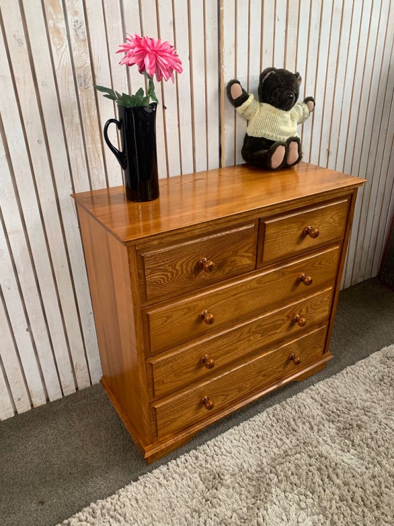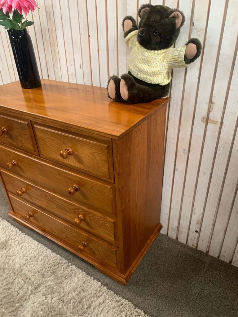 This beautiful solid elm chest of drawers is a classic and practical addition to any bedroom or living space. Featuring a warm natural wood grain and traditional design, it provides excellent storage while adding character to your home.