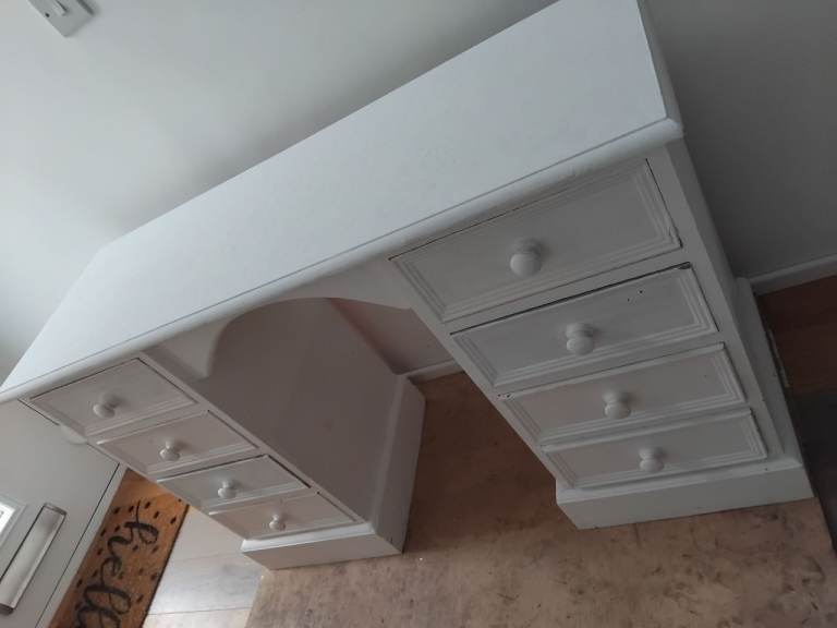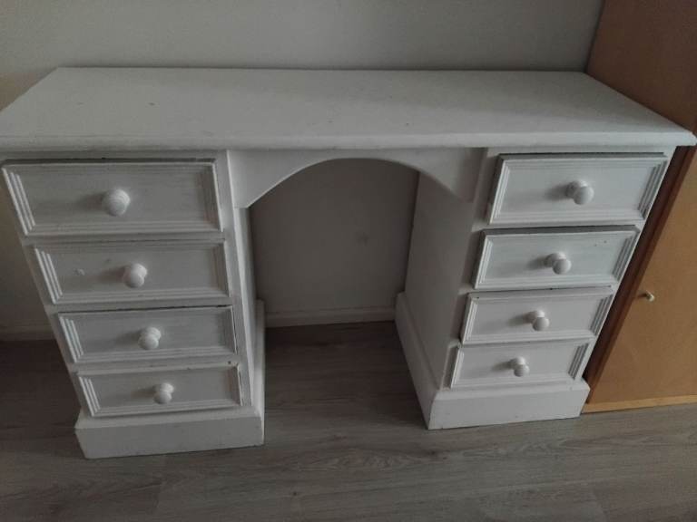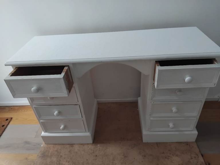 White solid wooden drawer unit, 4 drawers each side, can be used as a dresser, side storage unit, sewing table, painting table etc. Has many uses and small enough to fit into any space.