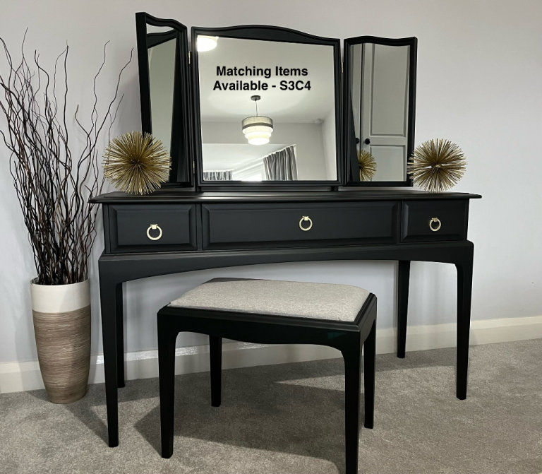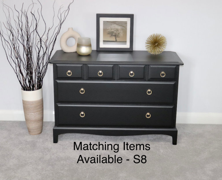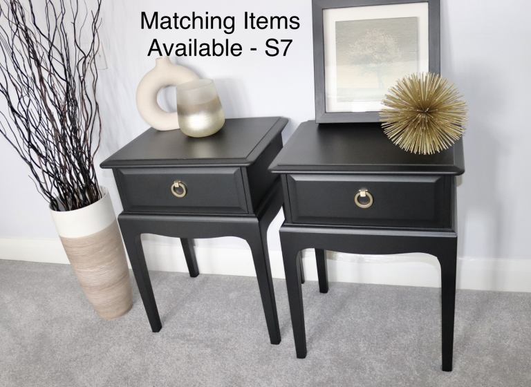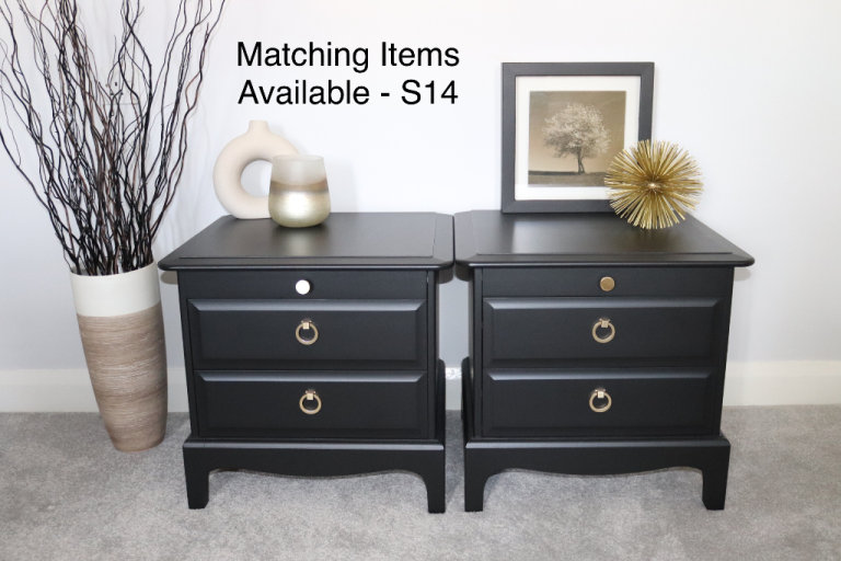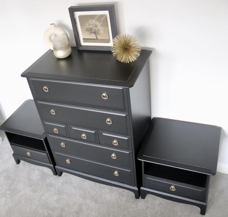 They have been given 3 coats of Black mineral paint, they have been given a protective coat of matt varnish for added durability. The drawers have been rejuvenated and deodorised with a perfumed wax.