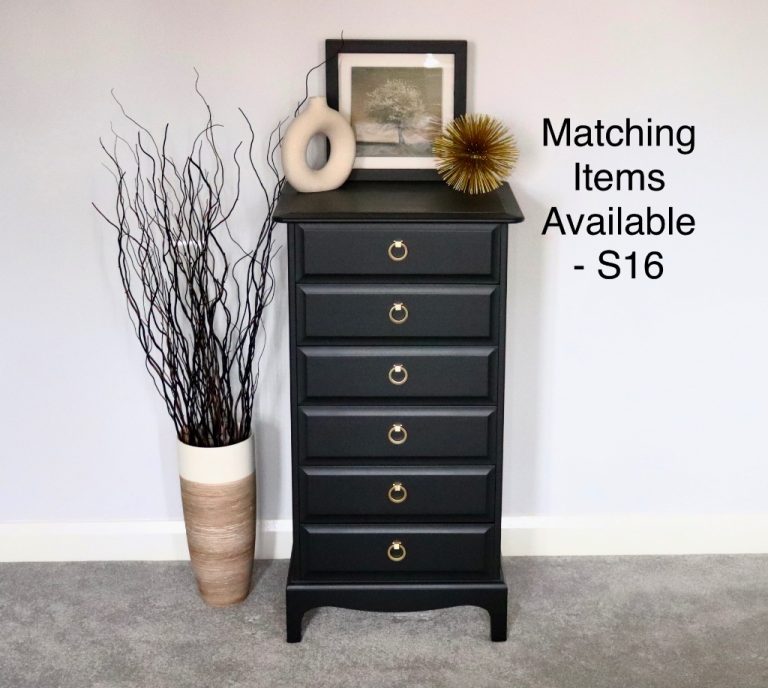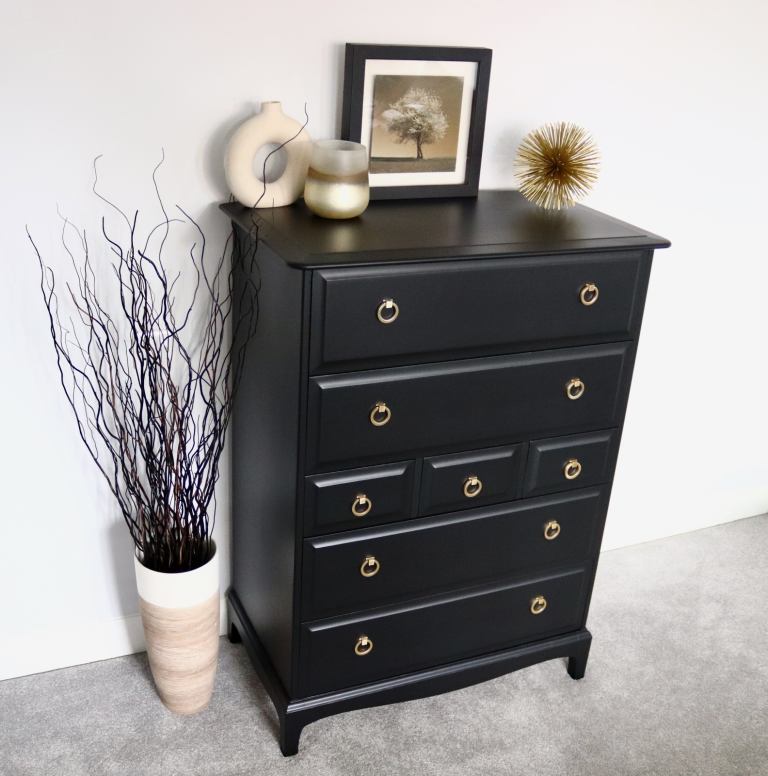 They have been given 3 coats of Black mineral paint, they have been given a protective coat of matt varnish for added durability. The drawers have been rejuvenated and deodorised with a perfumed wax.