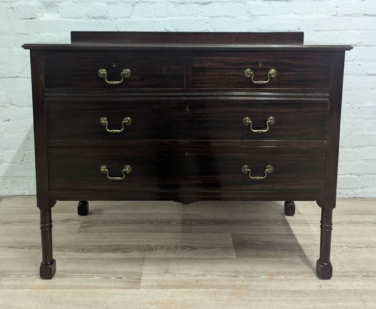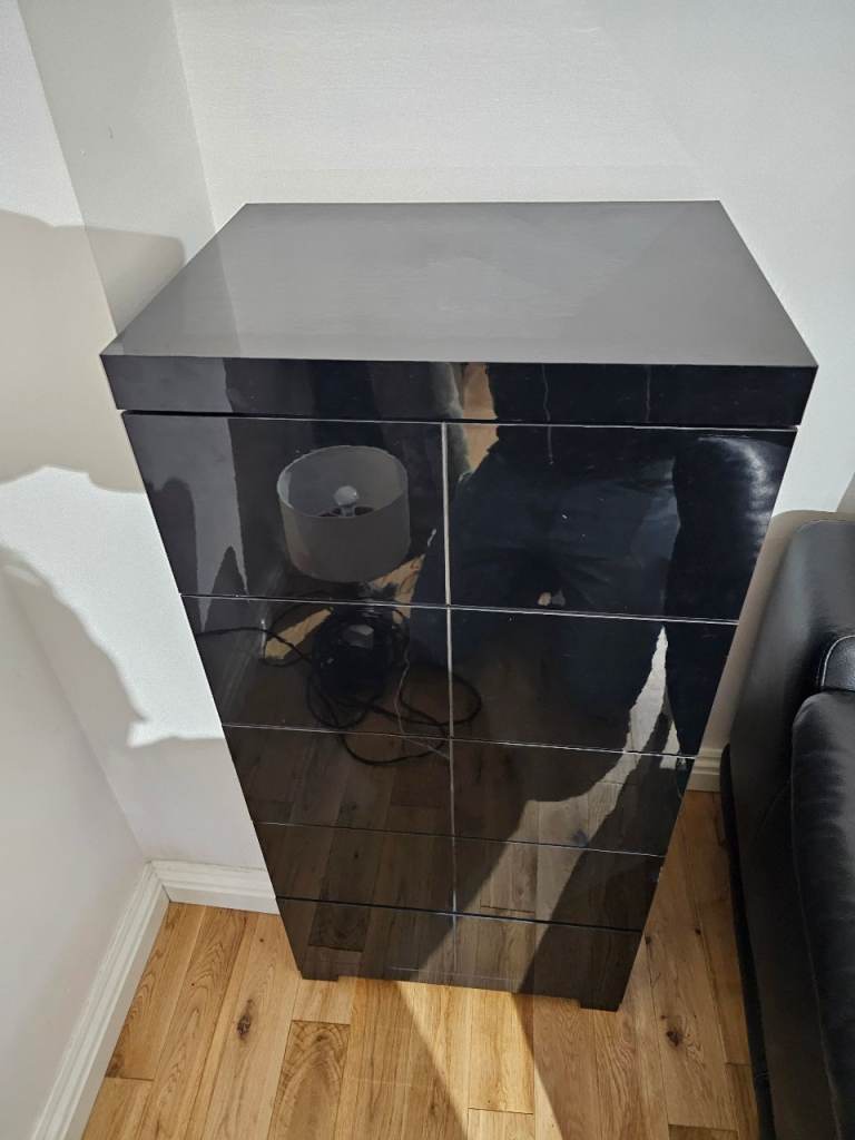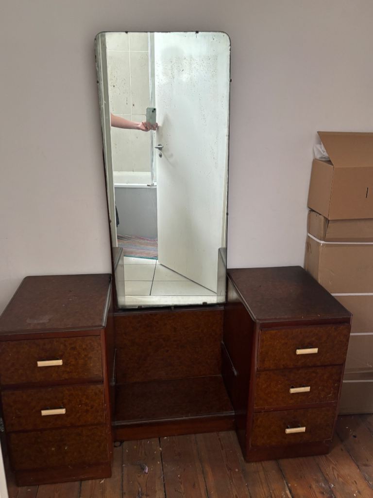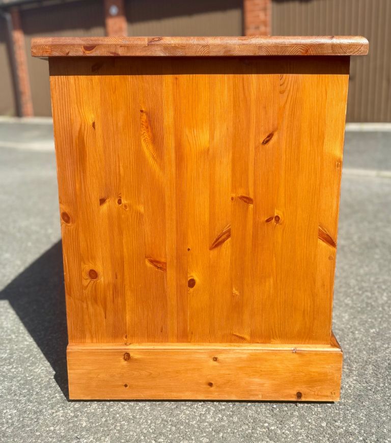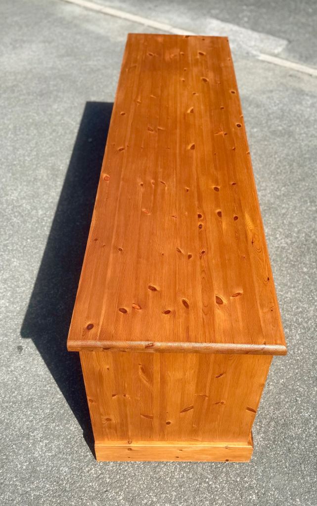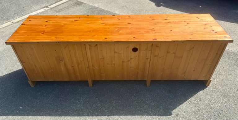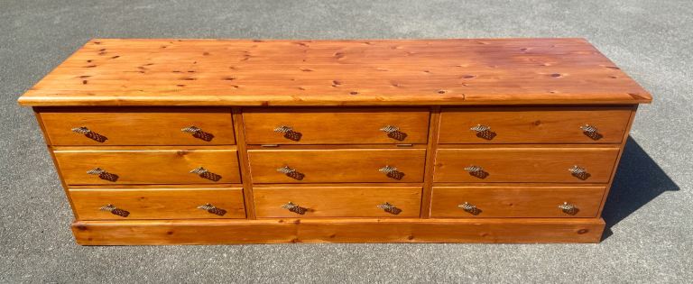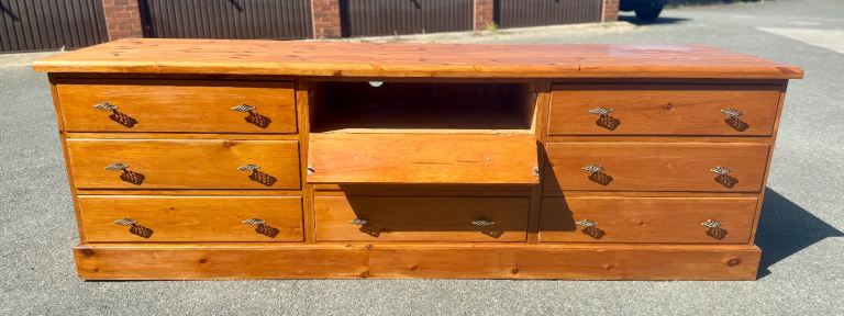 Sturdy, custom made, large pine French bank of drawers in very good condition, freshly woodstained timber, with 8 large drawers & 1 central false dropdown front for multimedia appliances storage. Twisted cage knobs. Size - L230cm x W60cm x H73cm. The unit was £700 new, but looking for a quick sale. £150 or best offer will be considered.