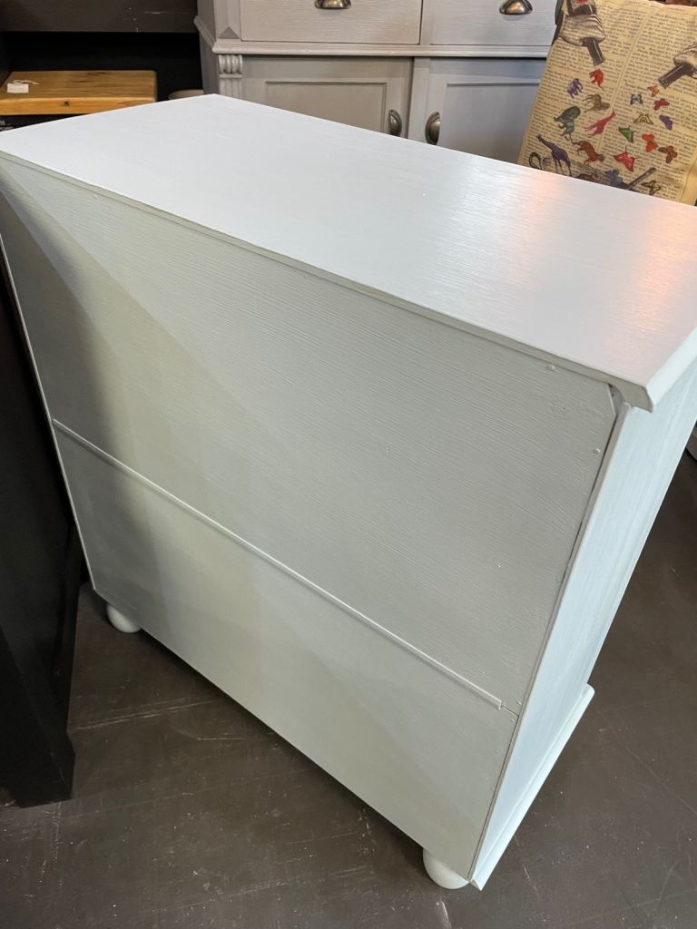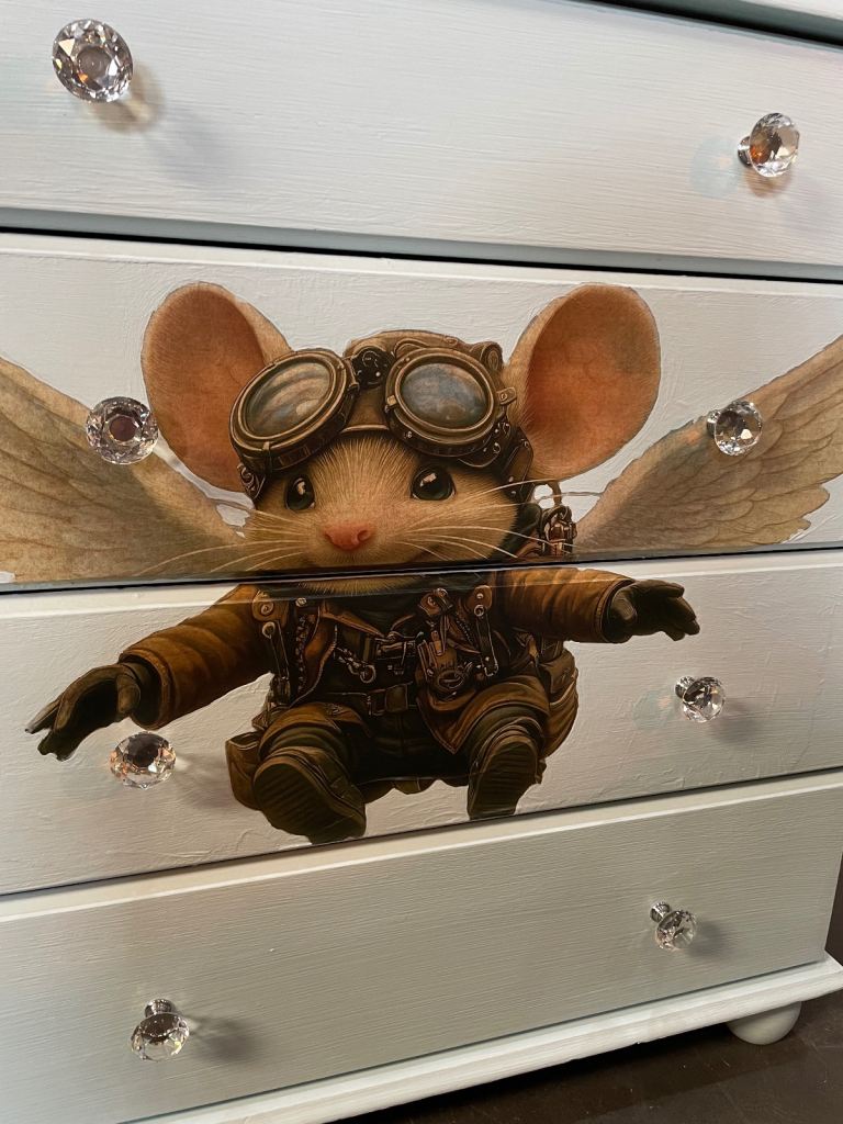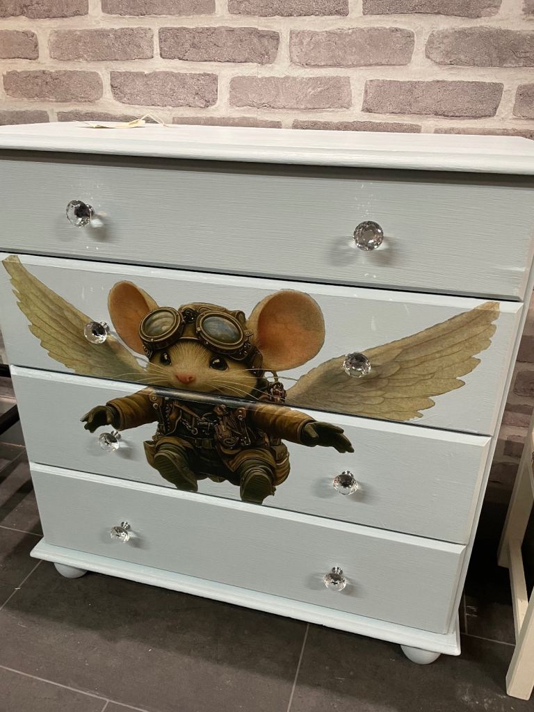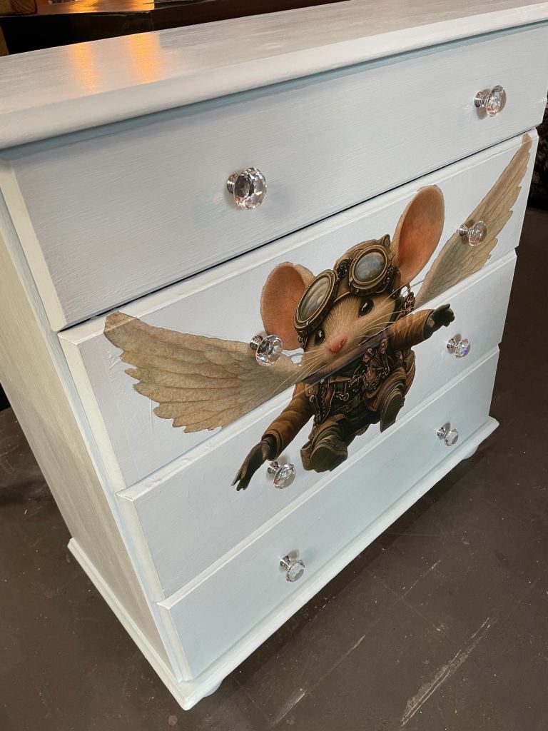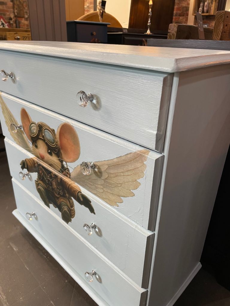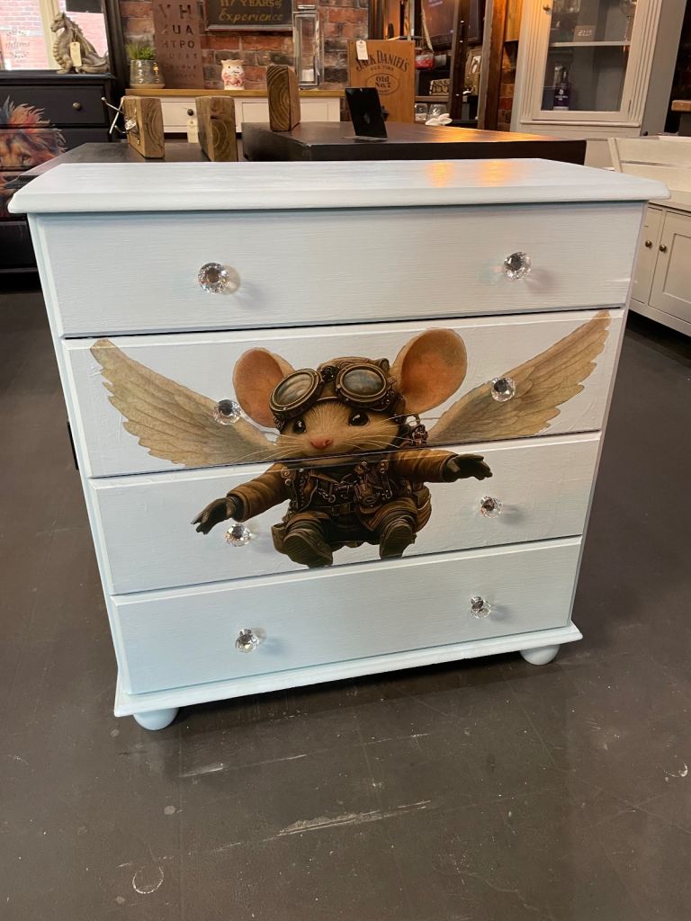 This sweet little chest has been finished in a soft pale blue and features a whimsical flying mouse with wings motif on the front , a fun touch that makes it truly one of a kind. 🐭🪽
