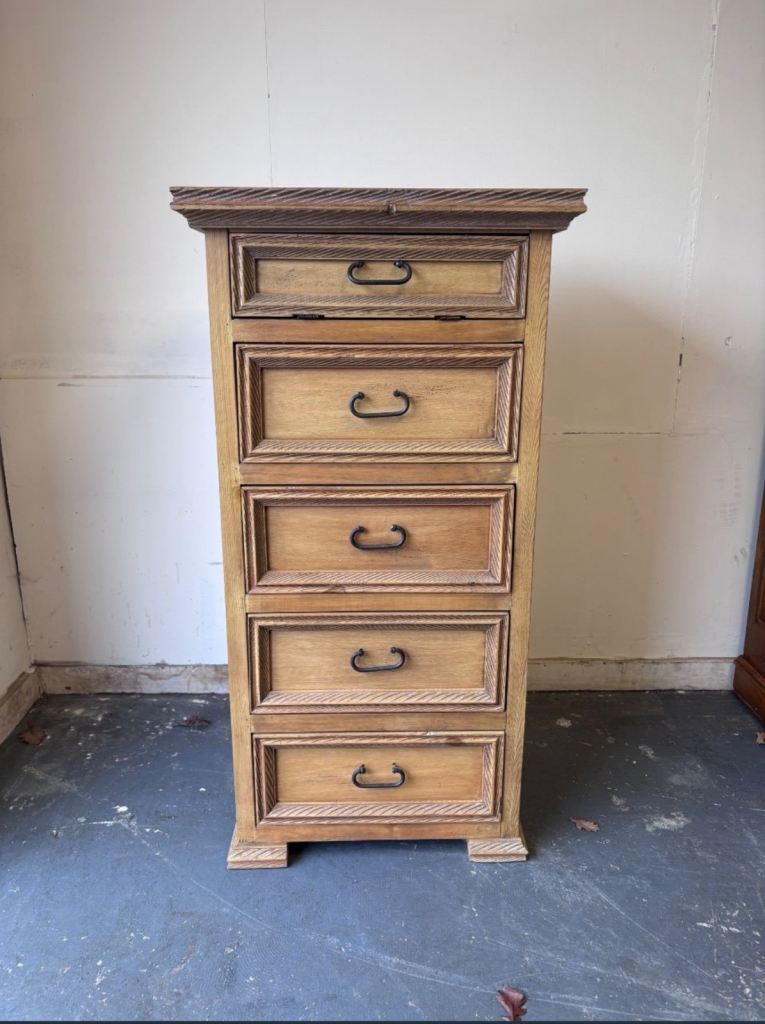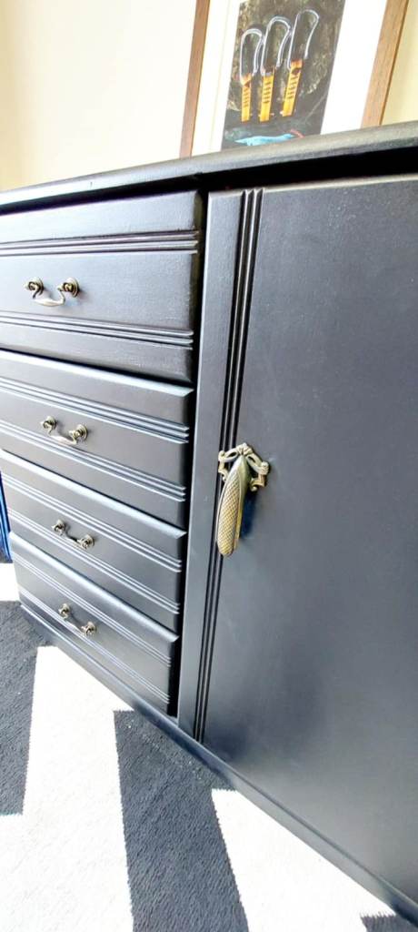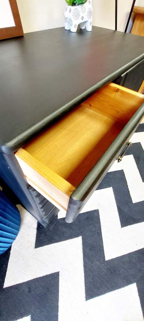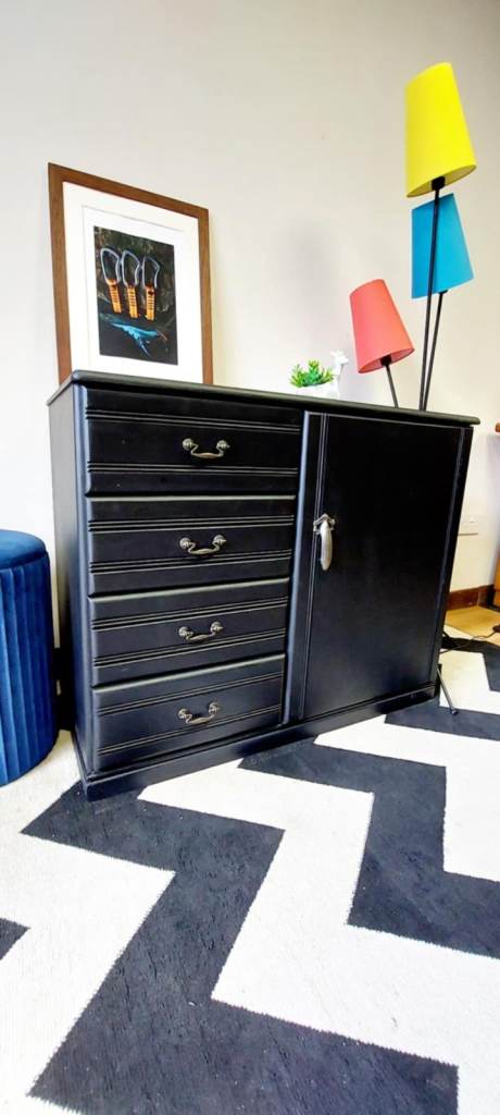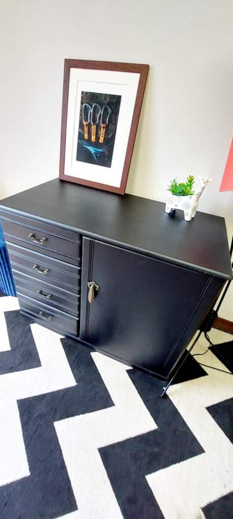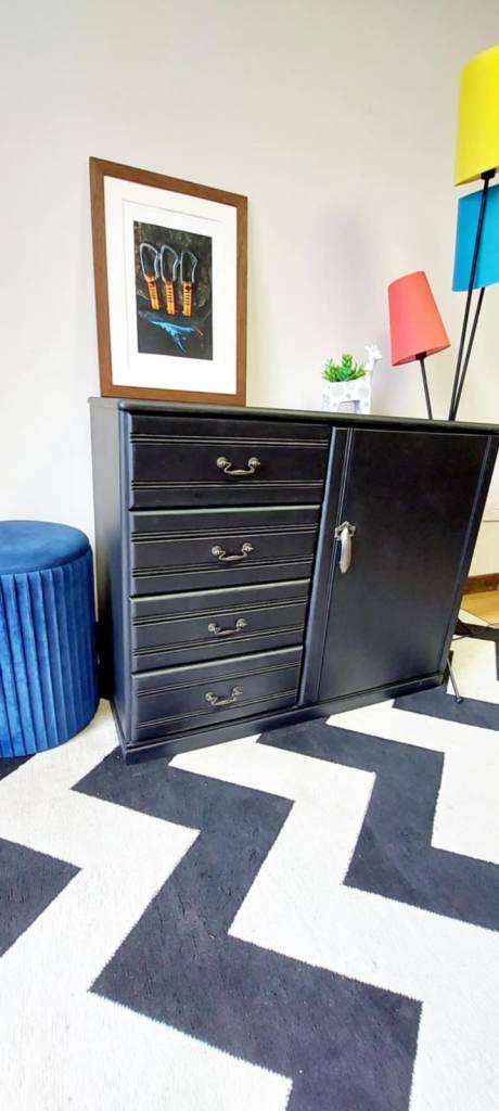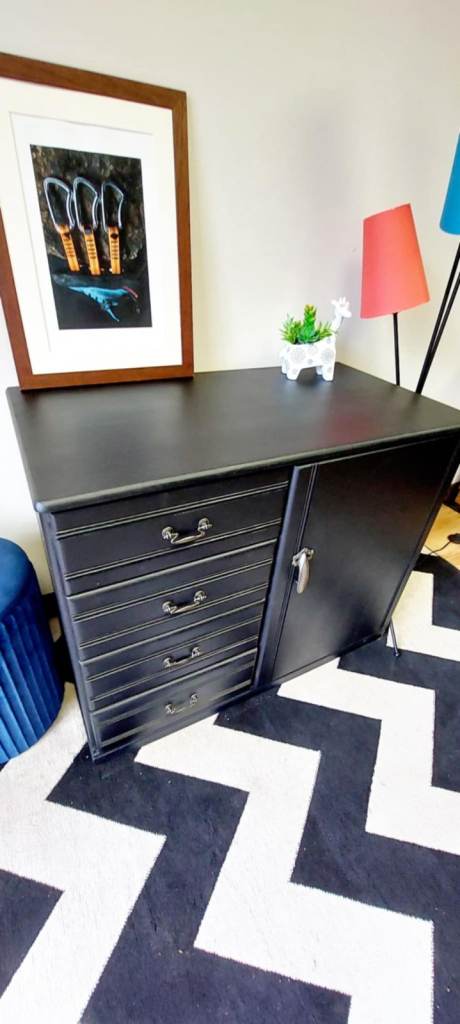 Beautiful and solid Stag Furniture piece, fully made of wood – natural finish inside and outside. Recently refinished in elegant matte black, featuring five spacious drawers and a cabinet with a decorative handle.