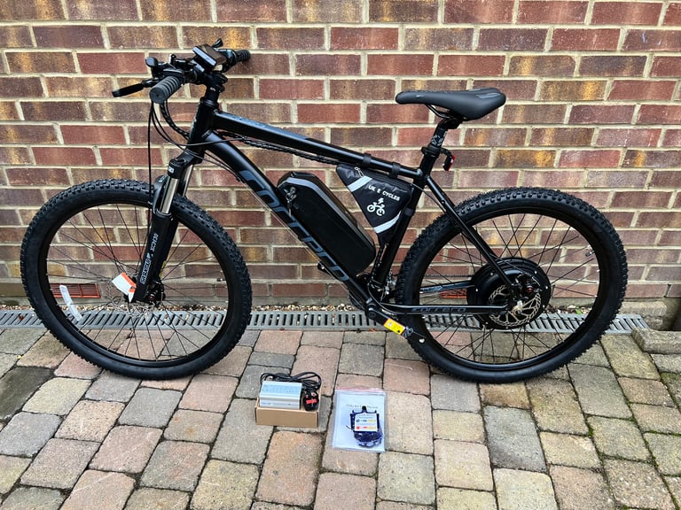 Rear wheel drive 1500w electric mountain bike with LCD display 48v 14ah battery with 2ah battery charger. The bike has 5 modes of pedal assist and a thumb throttle Speed 33mph+ Bike comes with two keys to remove battery