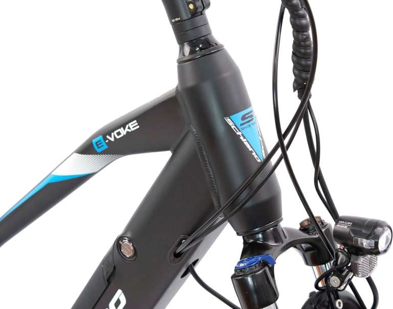 The E-Voke is equipped with a 36V, 11.6Ah, 417.6Wh removable, frame integrated lithium battery that: