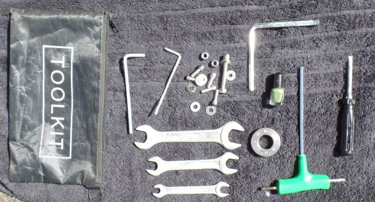 The trike comes with fully functional battery charger (not pictured), tool kit, spare nuts & bolts and touch-up paint. Sadly, I don't have the instruction manual.