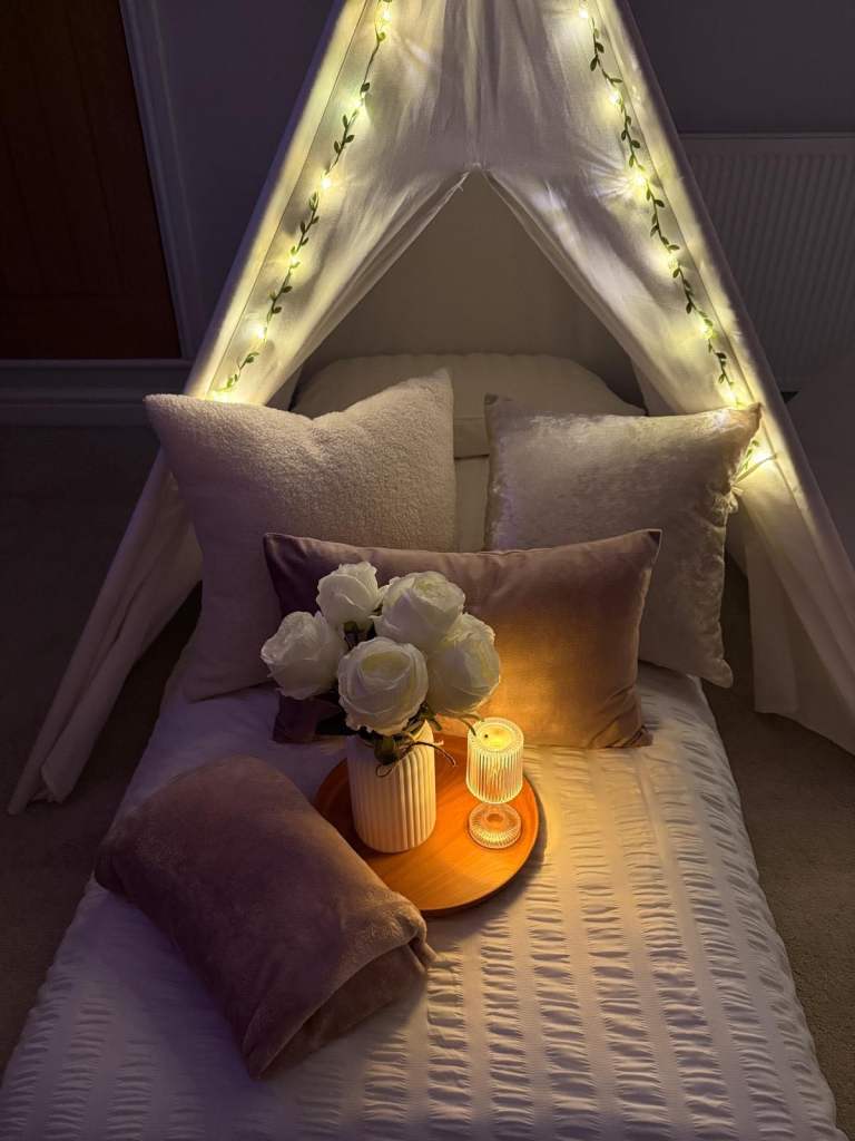 • Fairy lights, decorative cushions, tray table