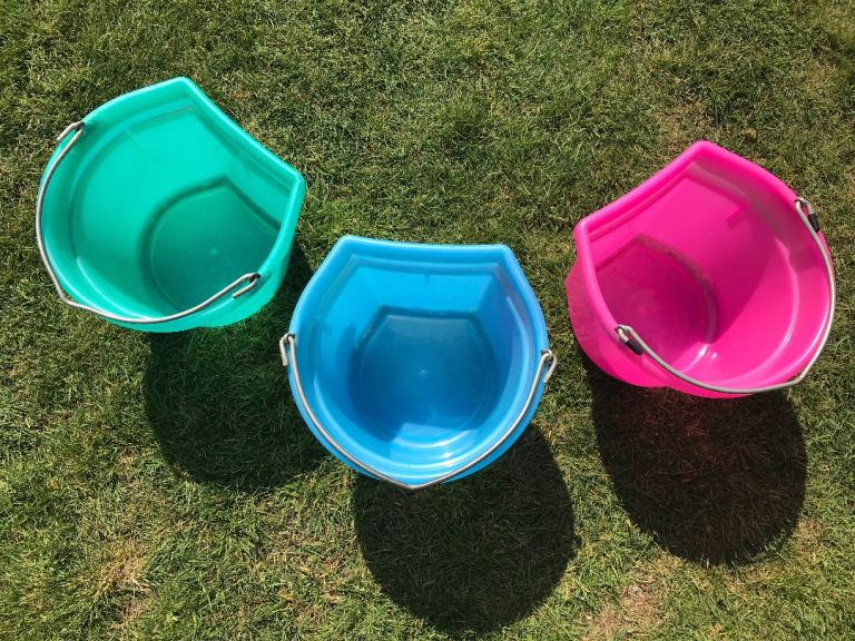 Three heavyweight flat back buckets for hanging in a stable etc, in excellent condition