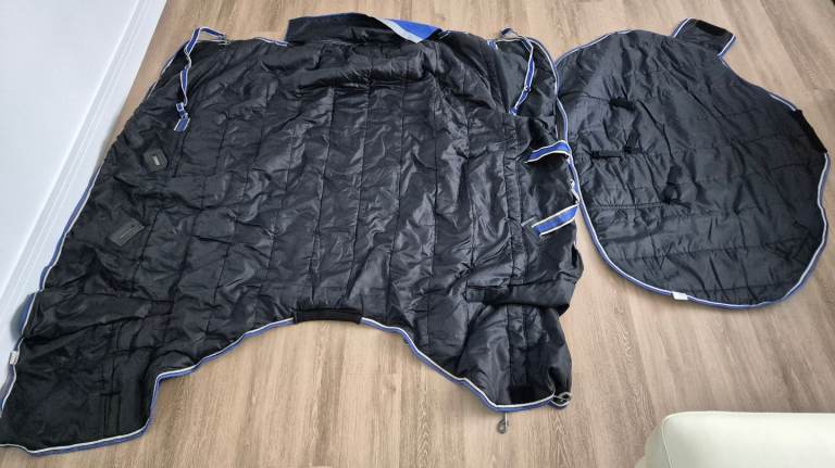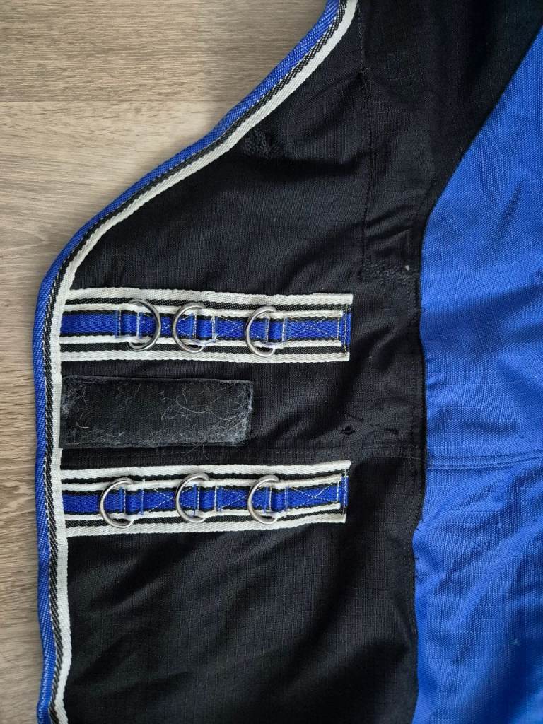 This great 6' rug with detachable neck cover has been professionally washed and reproofed. It's previous horse wearer tore the shoulder off, but that has been professionally mended as well by someone who used to make rugs for a living. I really had to look to find the repair! Please see photos.