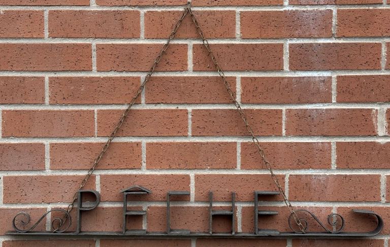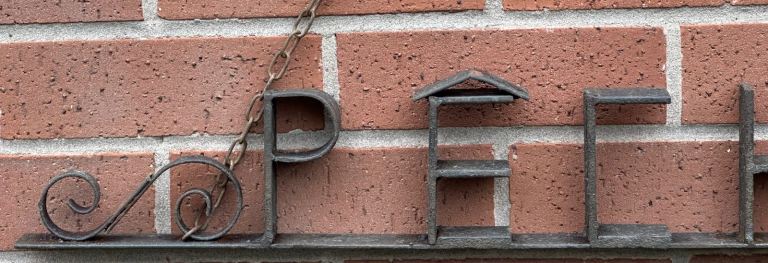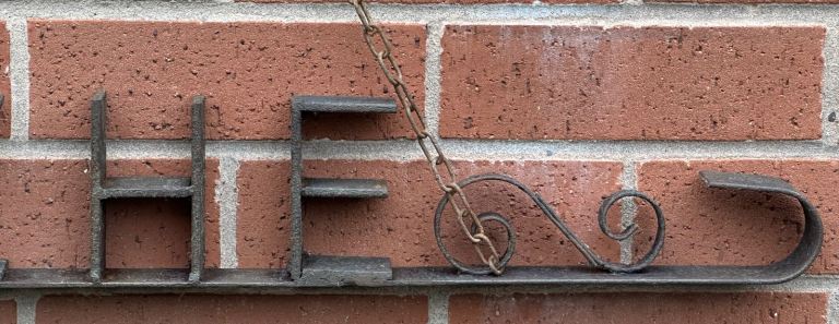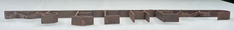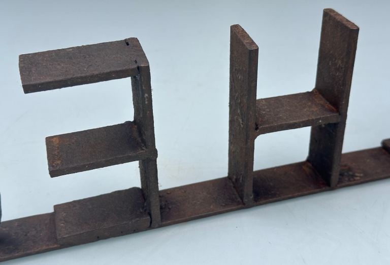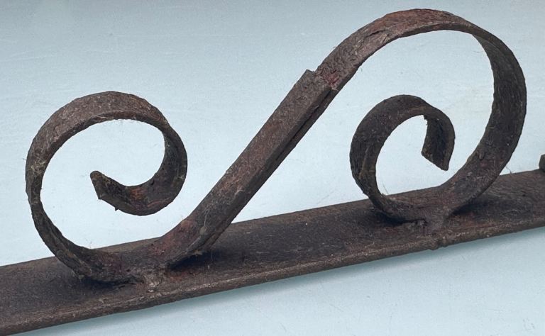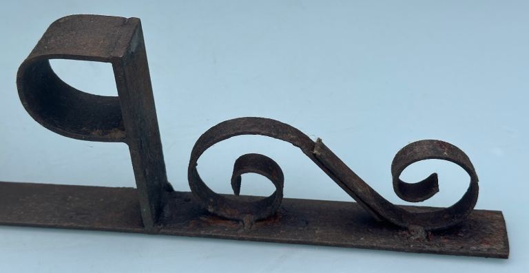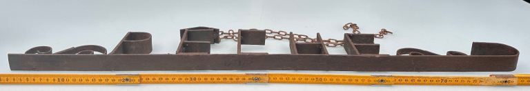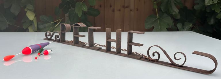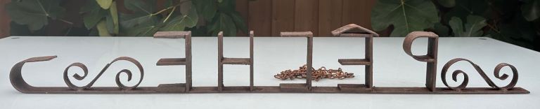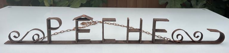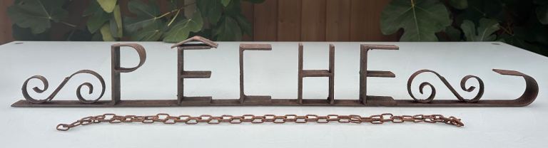 Consists of a metal base bar with the word PÊCHE welded in place, some scrollwork to either side and a curved end to resemble a hook.