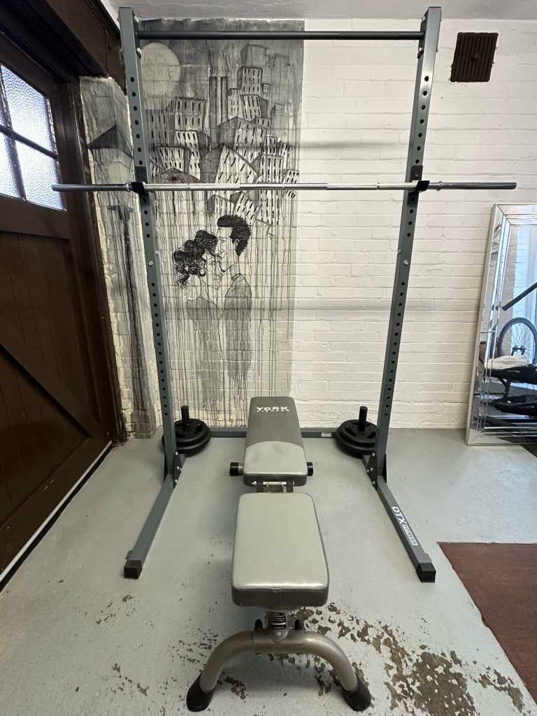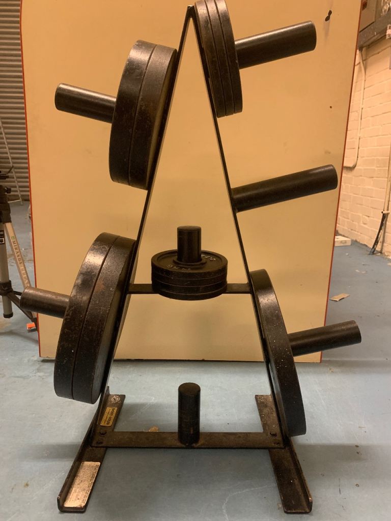 2 cast iron 5kg, 4 concrete filled 5 kg weight plates