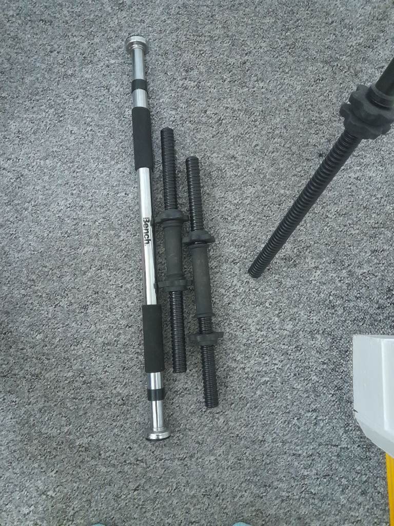 Situp board, small weights bar x2, large weight bar, pull up bar and weights. Can drop off if local.