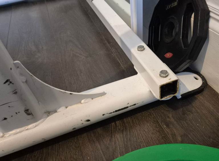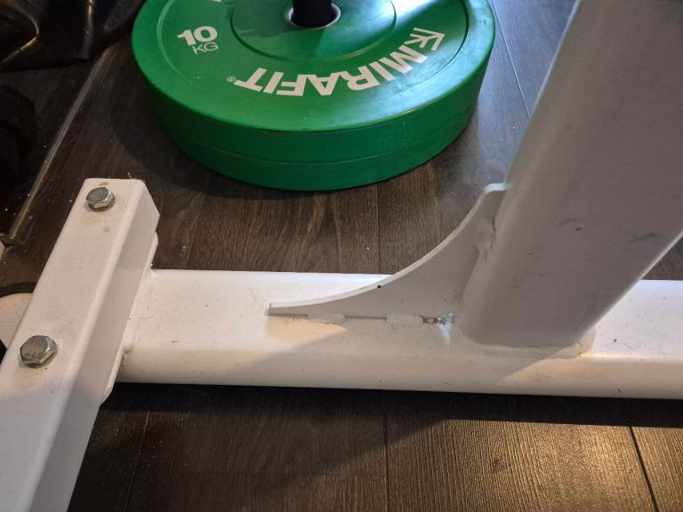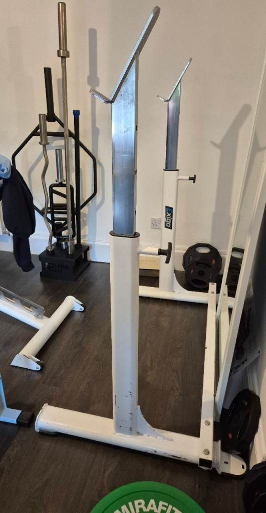 This is a used but fully-functional squat stand. It has some relatively superficial corrosion in places at the bottom of the stand, as it had been housed in an outbuilding for a number of years. Otherwise, it is very sturdy and well-made, so there are no wobbles. The 'uprights' can be adjusted reliably and easily; the adjustment mechanisms haven't been affected by where the stand was kept previously.
