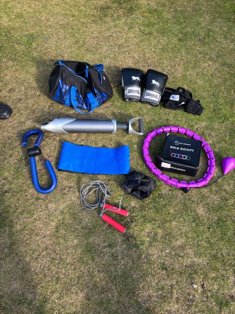 Various pieces of fitness equipment, the weighted hula hoop is new and never used.