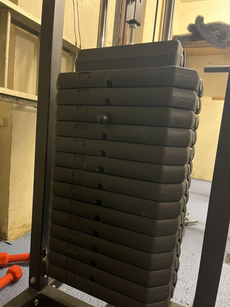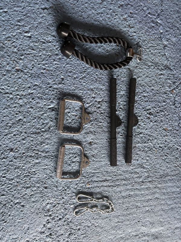 180kg Total Weight – 90kg Per Side. Includes 2 Straight Bar Handles, 2 Steel Chains & 2 Chrome Stirrup Handles, As Well As a Tricep Rope.
