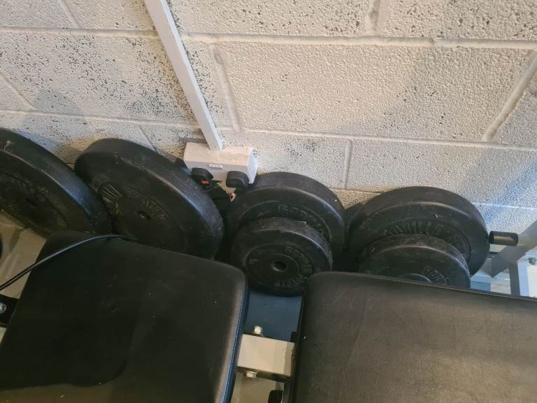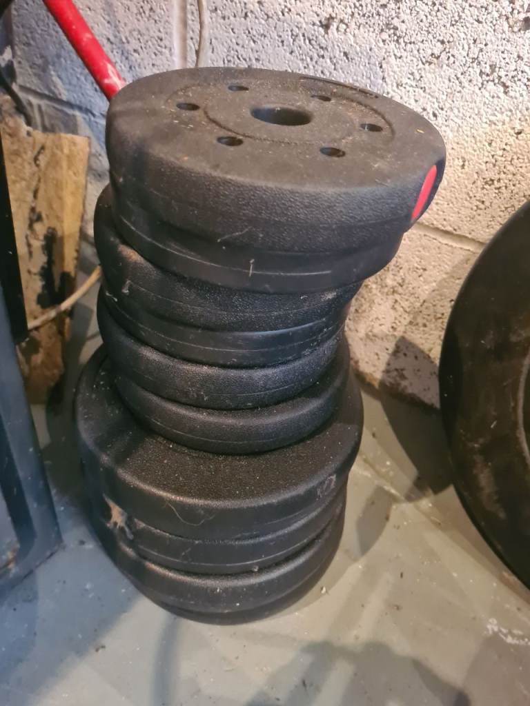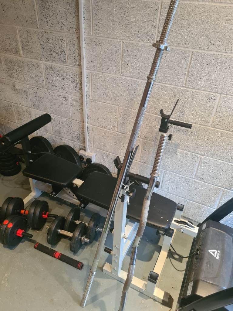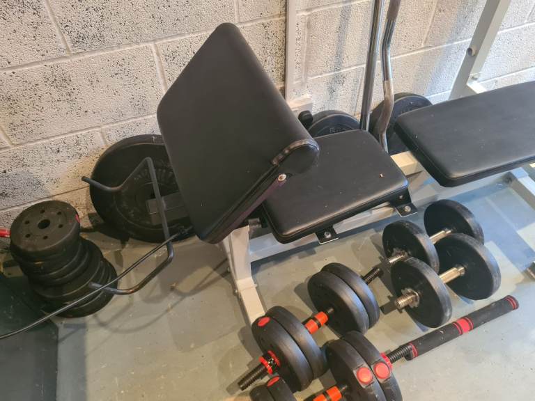 All in 1 home gym set. With a mixture of weights and dumbells.