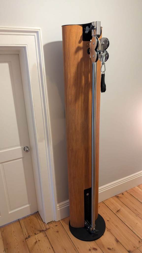 Cable machine from Nohrd. Retails at £1800. Currently unassembled for easy collection. The oak body is in perfect condition. Been used infrequently in a home gym as seen in the first photo.