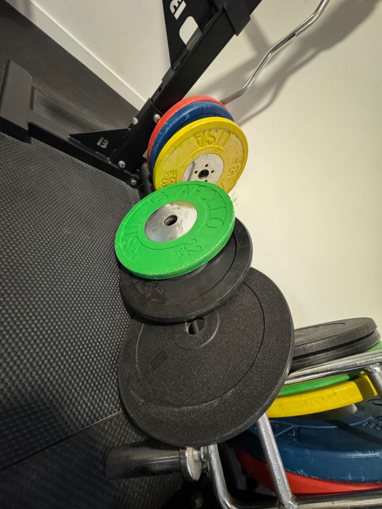 - All plates are Olympic bumper with 25-10kg are Apollo from Fitness Superstore. 5kg and 2.5kg “unbranded”.