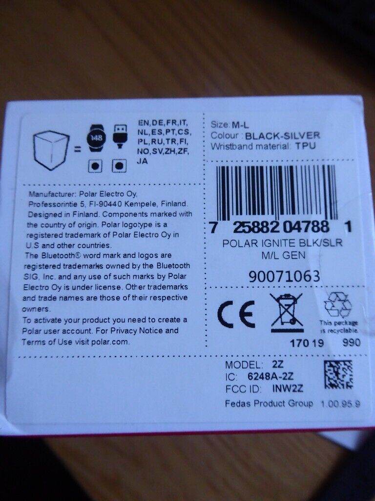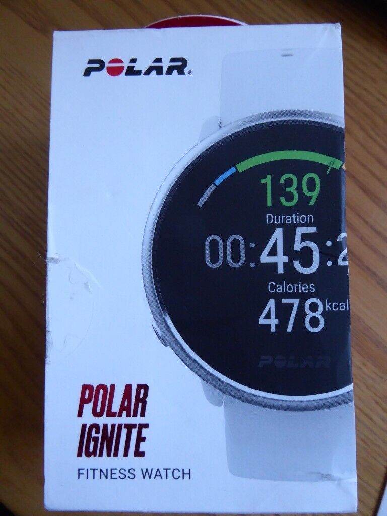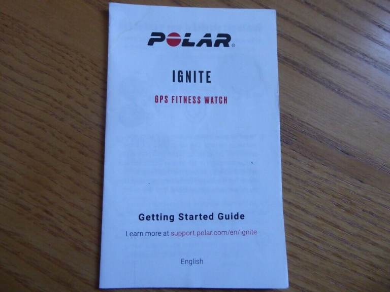POLAR IGNITE GPS FITNESS WATCH with box, charging cable, start guide and user instructions.